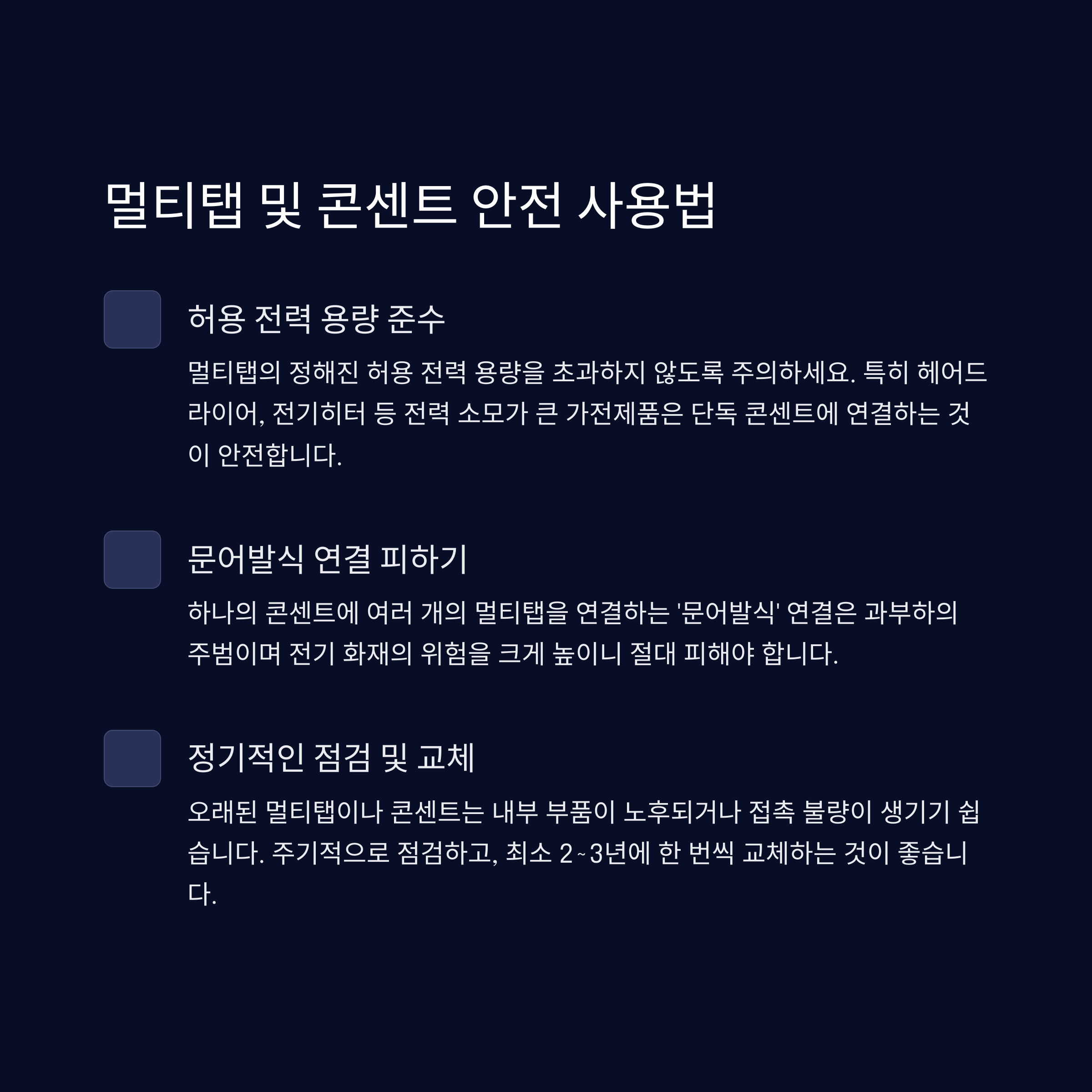 - 문어발식 연결 피하기: 하나의 콘센트에 여러 개의 멀티탭을 연결하는 '문어발식' 연결은 과부하의 주범입니다. 이는 전기 화재의 위험을 크게 높이니 절대 피해야 합니다.