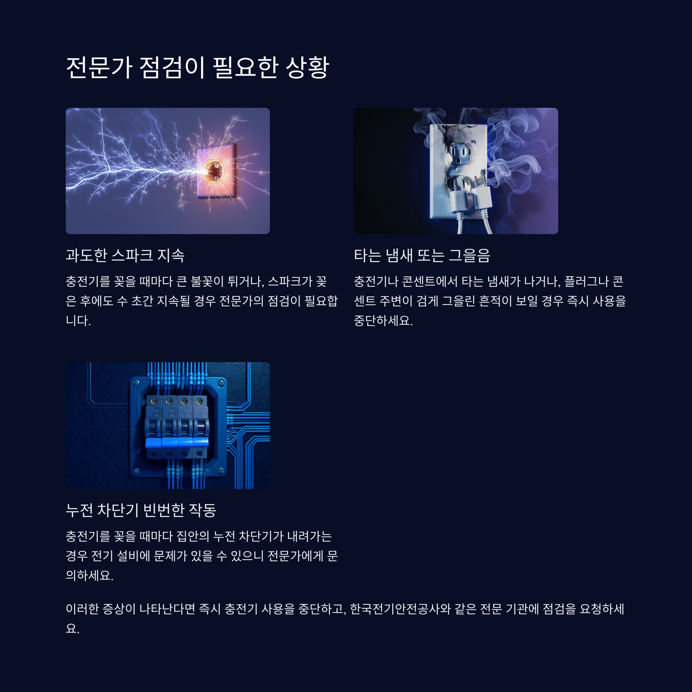 | 과도한 스파크 지속 | 충전기를 꽂을 때마다 큰 불꽃이 튀거나, 스파크가 꽂은 후에도 수 초간 지속될 경우. |