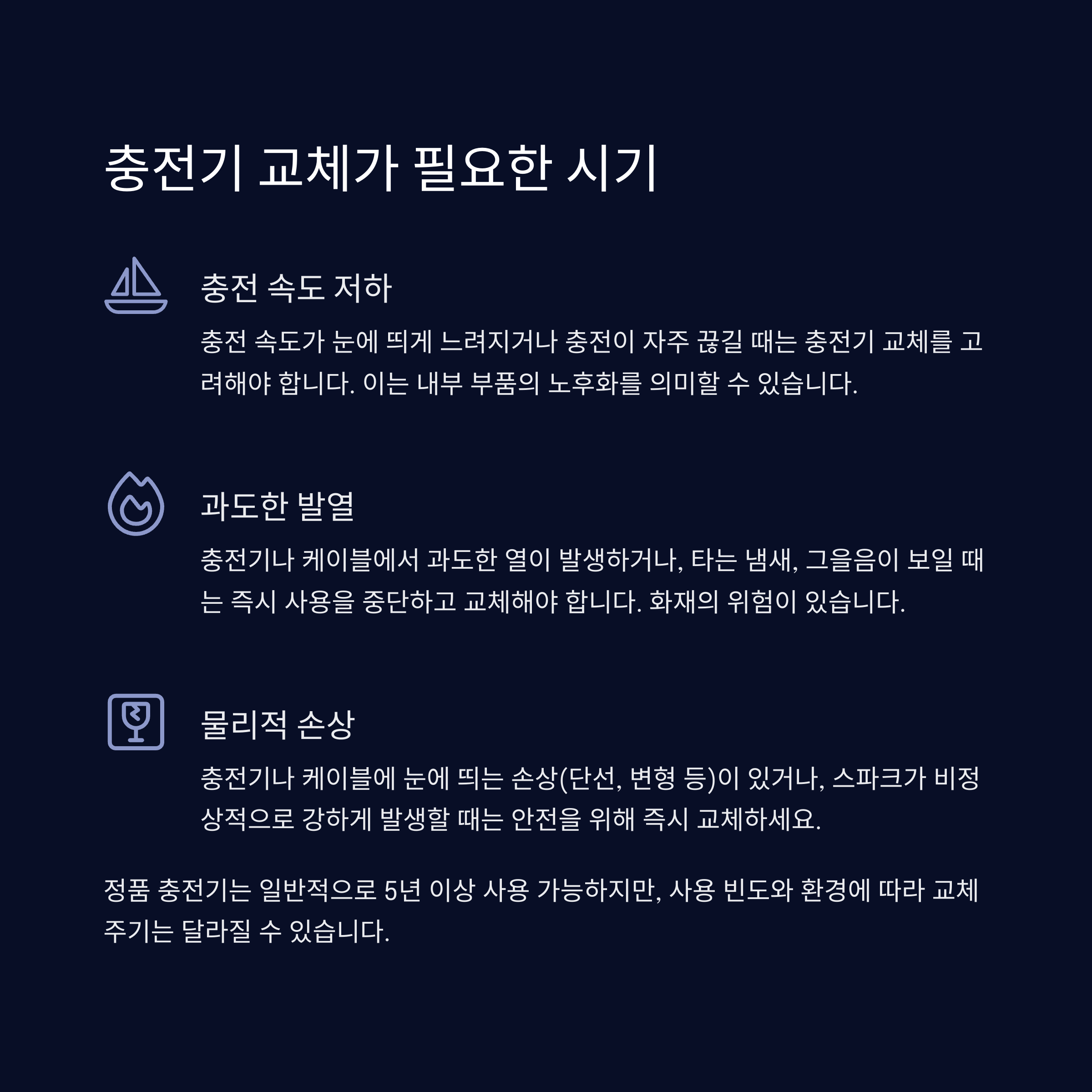 - 일반적으로 정품 충전기는 5년 이상 사용 가능하지만, 사용 빈도와 환경에 따라 교체 주기는 달라질 수 있습니다.