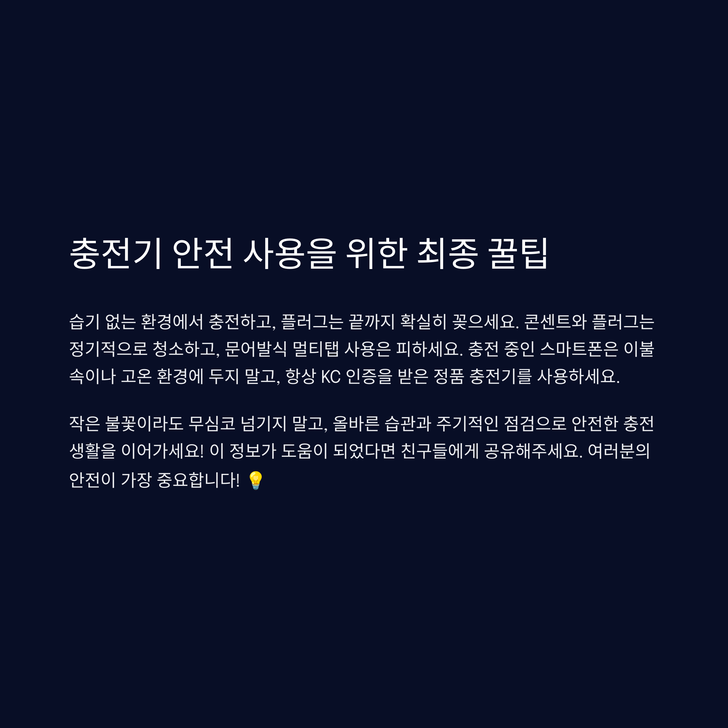 충전기 스파크에 대한 불안감을 해소하고 안전한 스마트폰 충전 환경을 만들기 위한 핵심 꿀팁들을 다시 한번 정리해 드립니다.