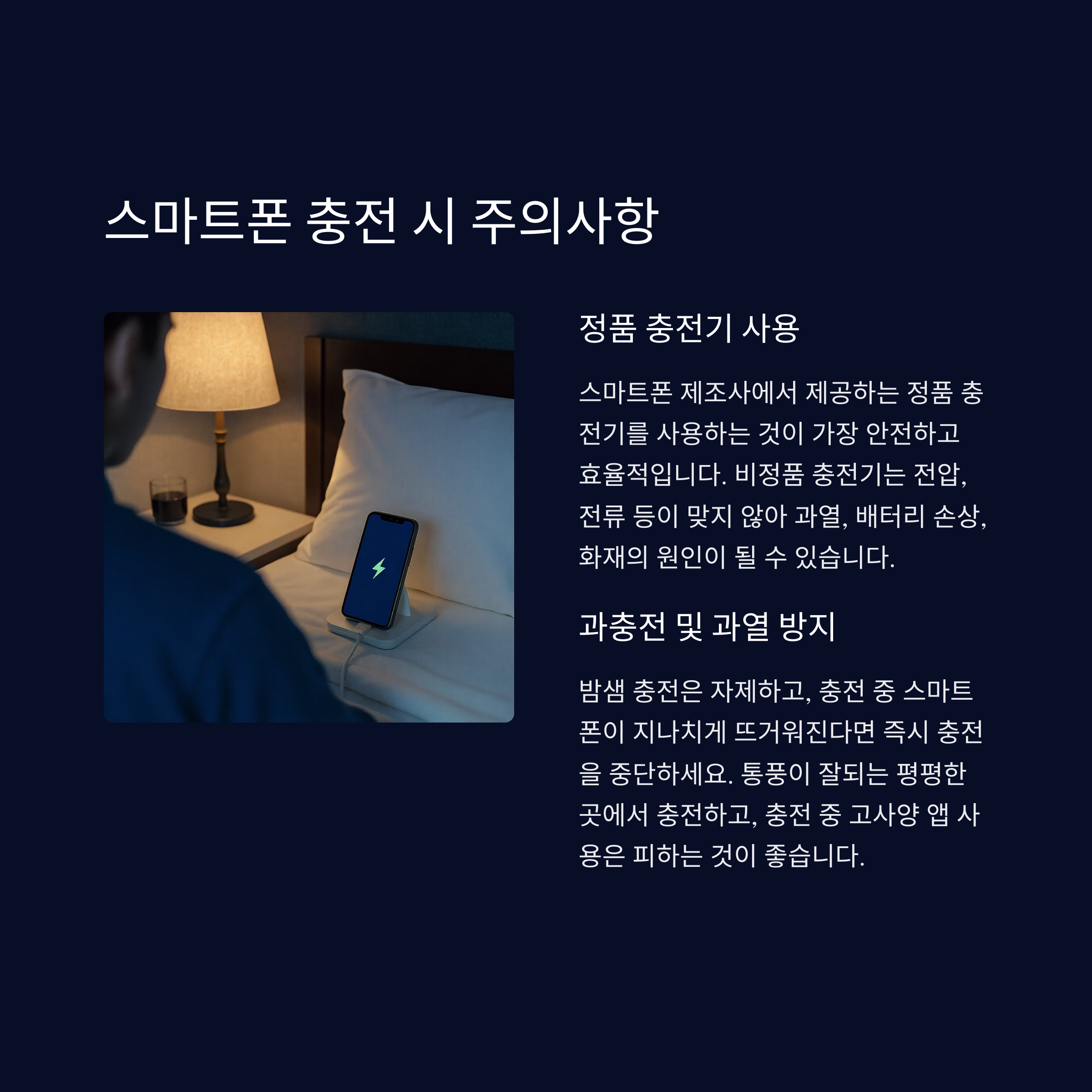 - 충전 중 스마트폰 관리: 충전 중 스마트폰을 이불 속에 두거나, 온도가 높은 곳에 방치하지 마세요. 발열이 심해지면 배터리 수명 단축 및 안전 사고로 이어질 수 있습니다.