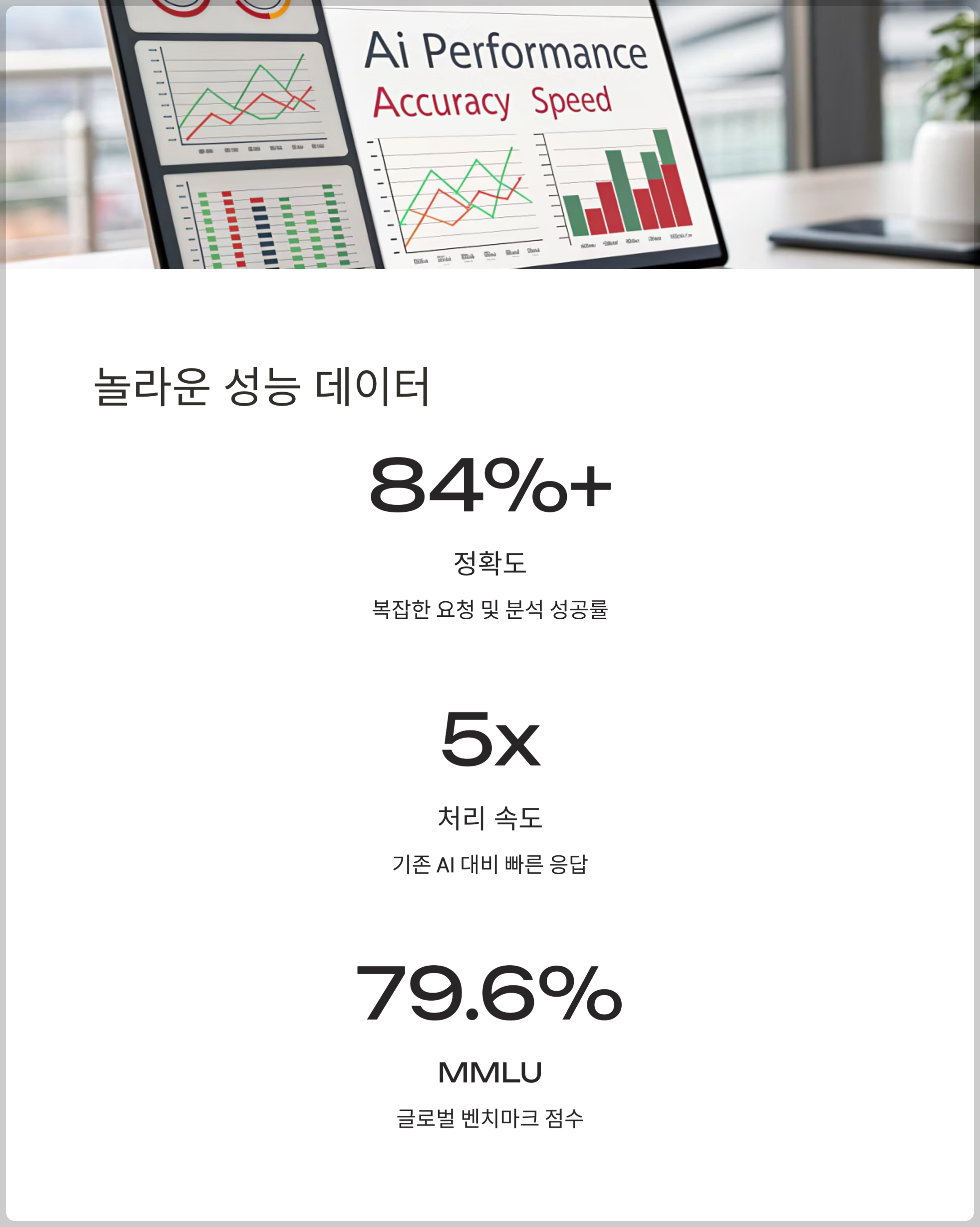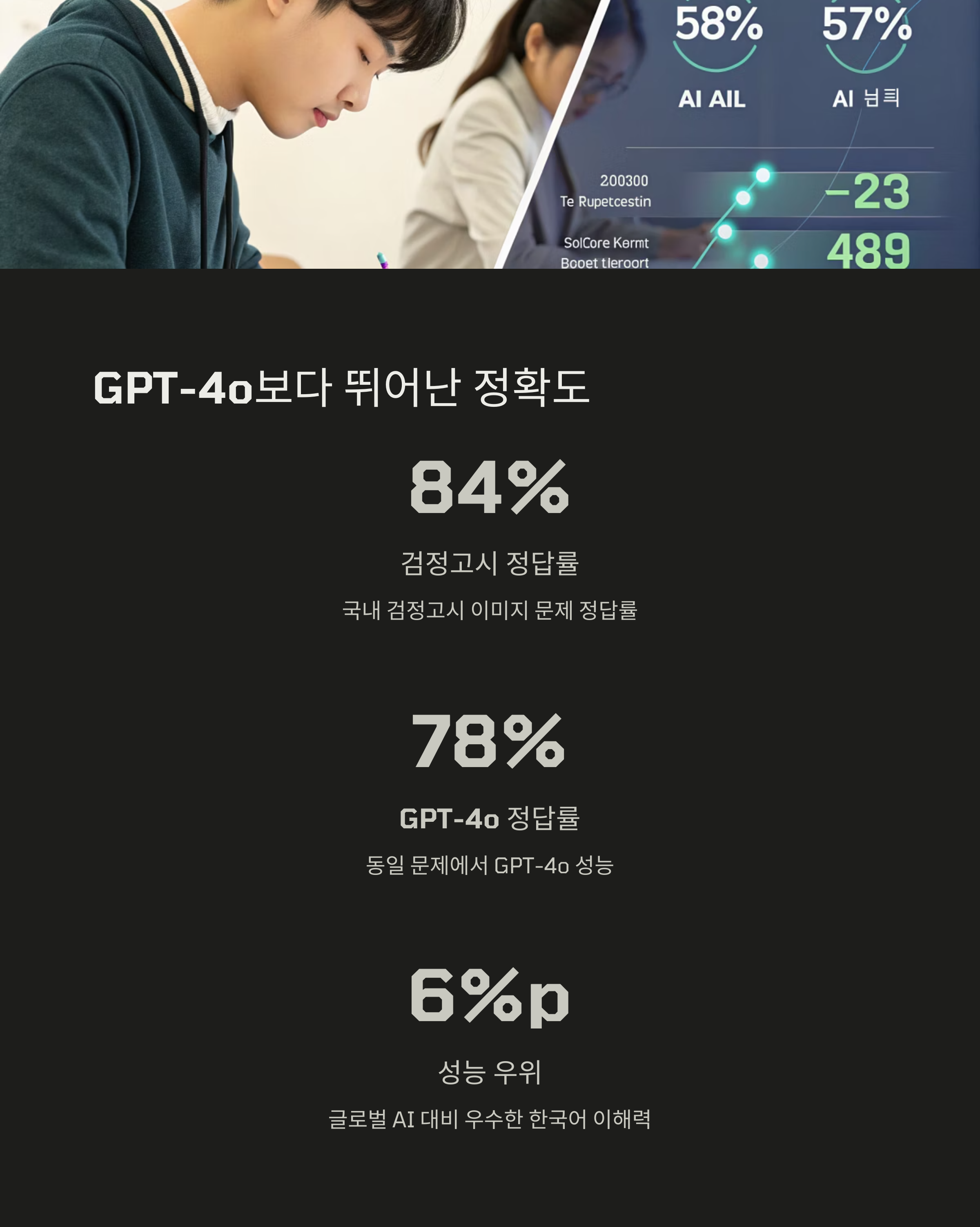 하이퍼클로바X는 다양한 한국어 기반 벤치마크에서 매우 높은 정확도를 자랑합니다. 예를 들어, 대한민국 검정고시 문제를 이미지 형태로 입력해도 약 84%의 정답률을 보였으며, 이는 GPT-4o(78%)보다 높은 수치입니다. 아래는 주요 벤치마크 성능을 정리한 표입니다.