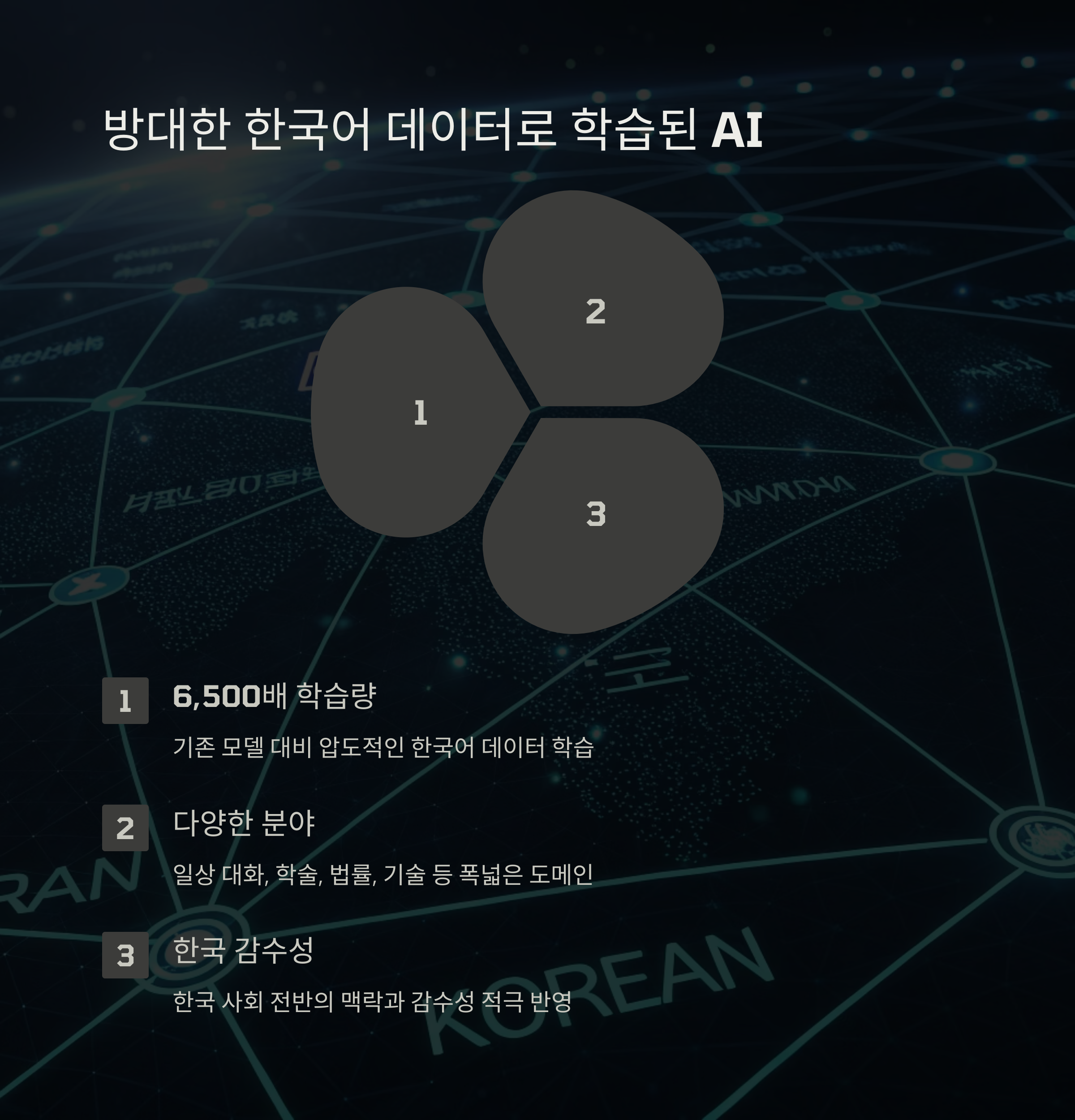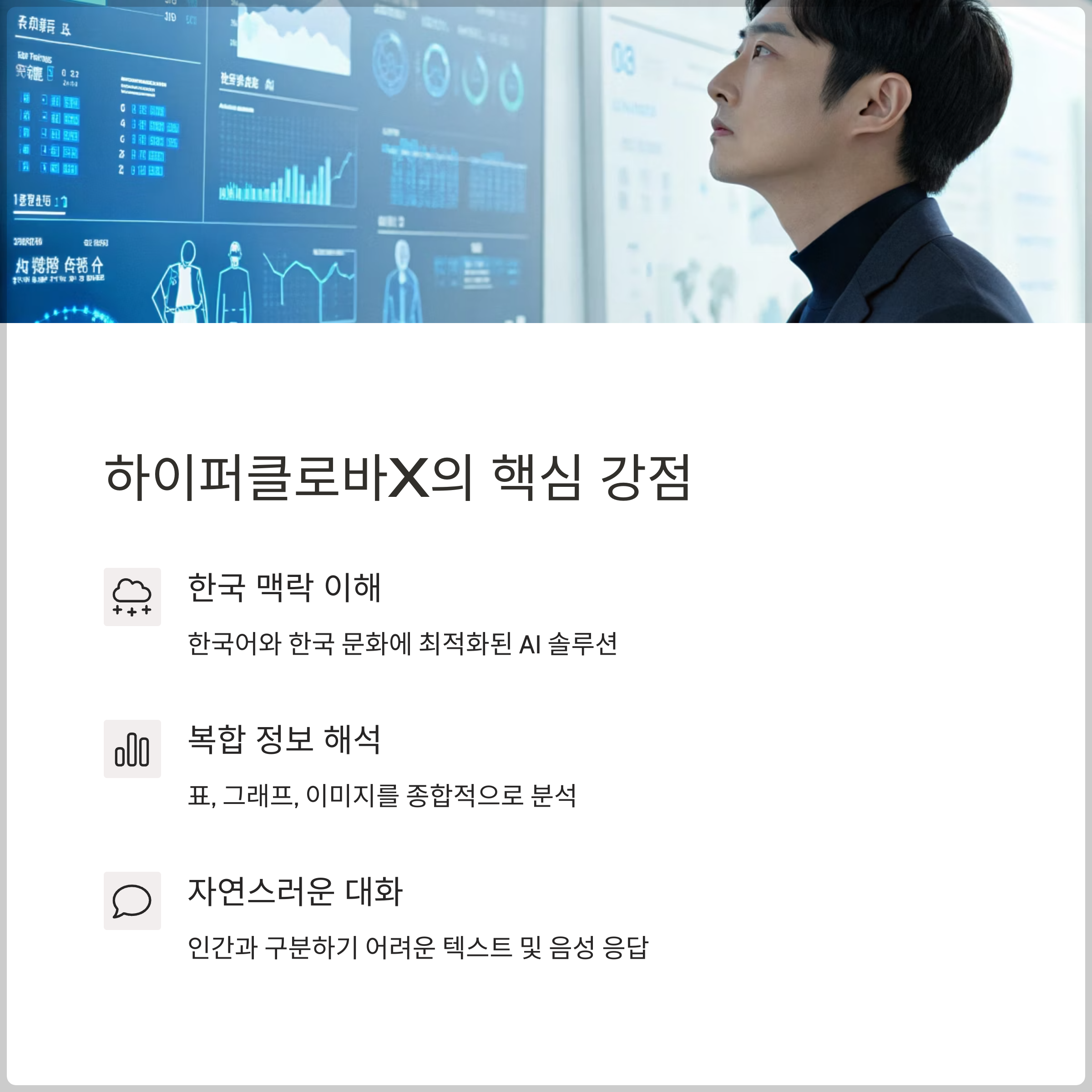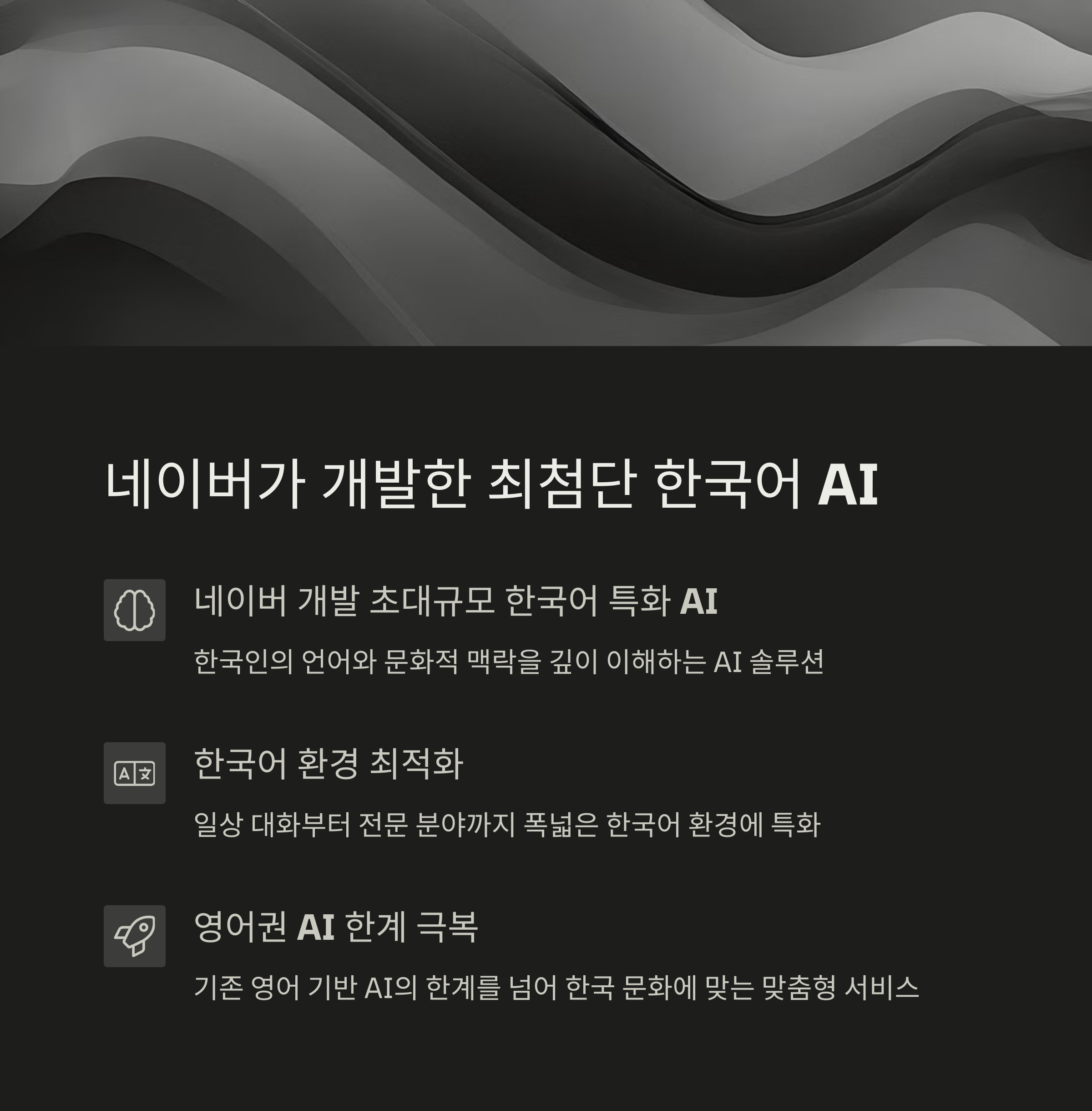 하이퍼클로바X(HyperCLOVA X)는 네이버가 개발한 초대규모 한국어 특화 생성형 AI입니다. 한국어 데이터만 무려 6,500배 더 많이 학습하여, 한국인의 언어적 맥락과 문화 이해도에서 탁월한 성능을 보여주죠. 일반적인 글로벌 AI와 달리, 하이퍼클로바X는 일상 대화부터 학술, 법률, 기술 문서까지 폭넓은 한국어 환경을 소화할 수 있습니다.