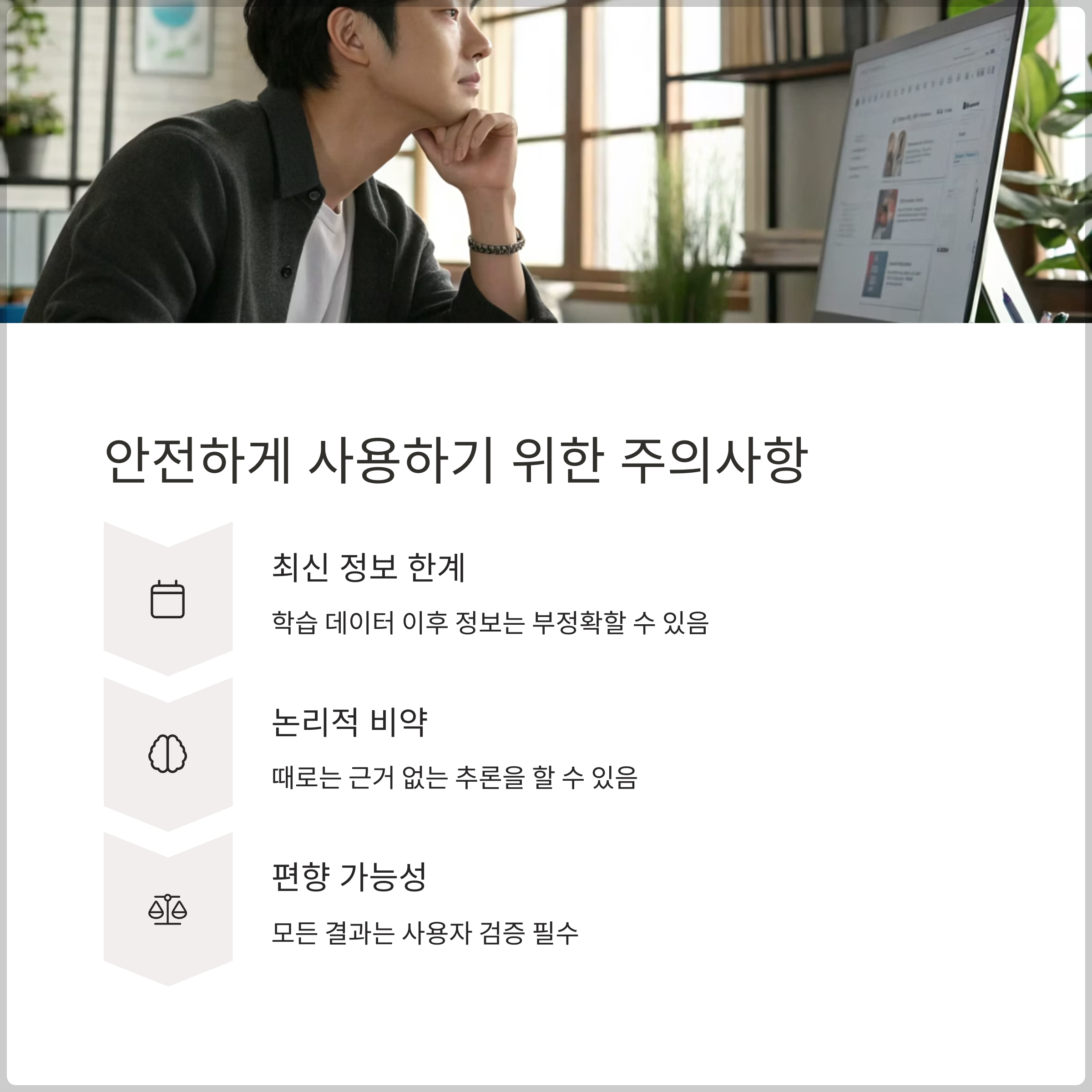 최신 정보 반영에 제한이 있을 수 있으며, 논리적 오류나 과장된 문장이 발생할 수 있어 사용자 검토가 반드시 필요합니다.