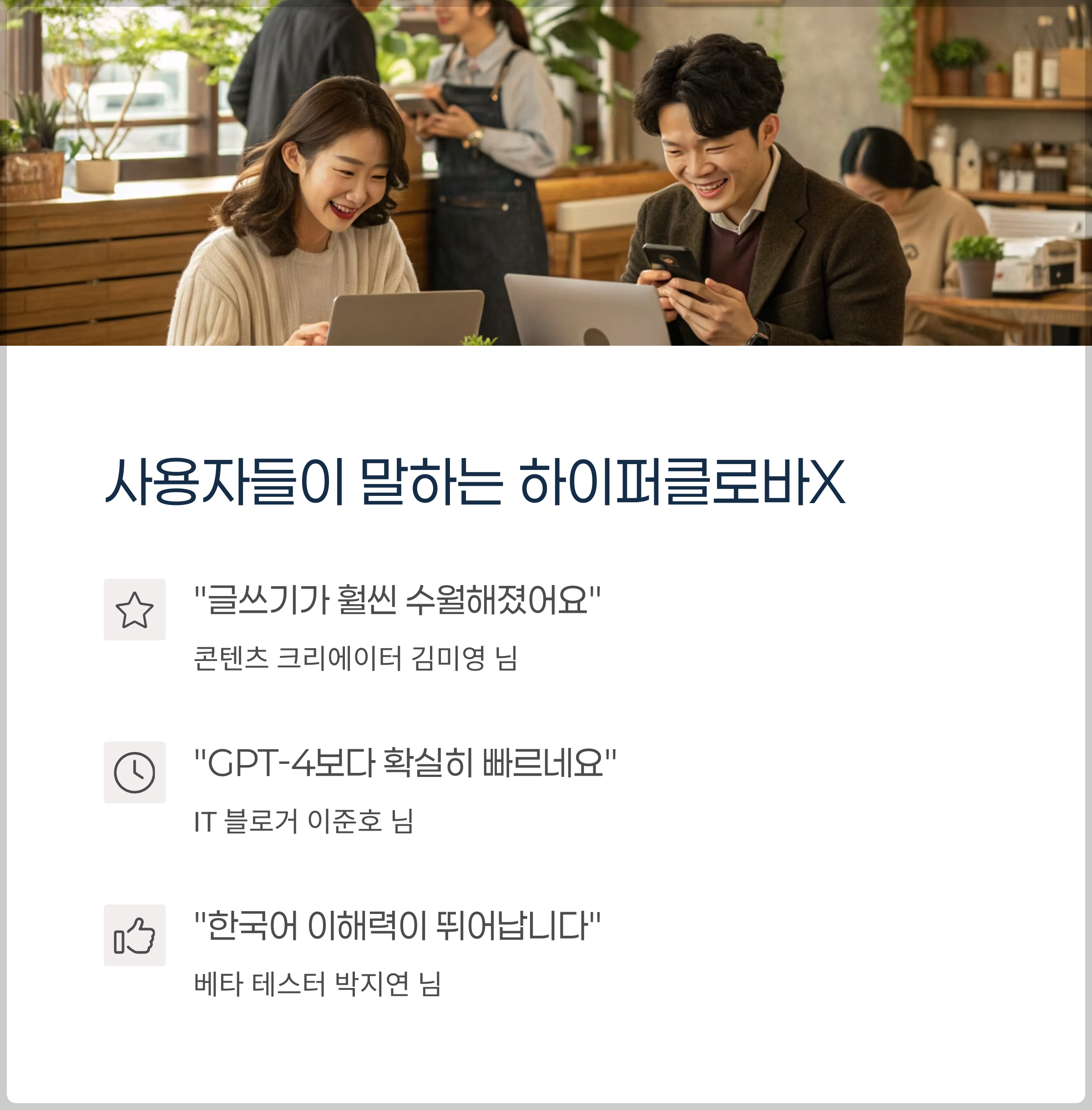 하이퍼클로바X의 베타 테스트에 참여한 사용자들 대부분은 “글쓰기가 훨씬 수월해졌다”는 평가를 내렸습니다. 특히 “질문을 입력하자마자 거의 즉시 답변이 나온다”, “GPT-4보다 빠르고 반응 속도가 놀랍다”는 피드백이 많았습니다. 이는 기존 대비 작성 시간 단축은 물론, 창작 피로도 역시 크게 낮춰주는 효과로 이어졌습니다.