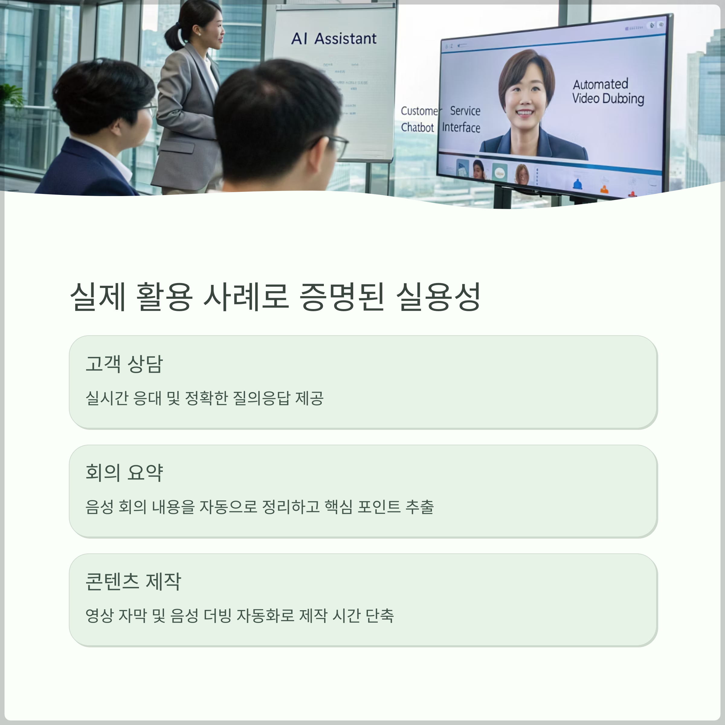 콜센터 자동화, 영상 자막 생성, 회의록 자동 요약, 다국어 번역 등 다양한 분야에서 활용되고 있으며, 특히 한국어 기반 고객 응대에 강점을 가지고 있습니다.