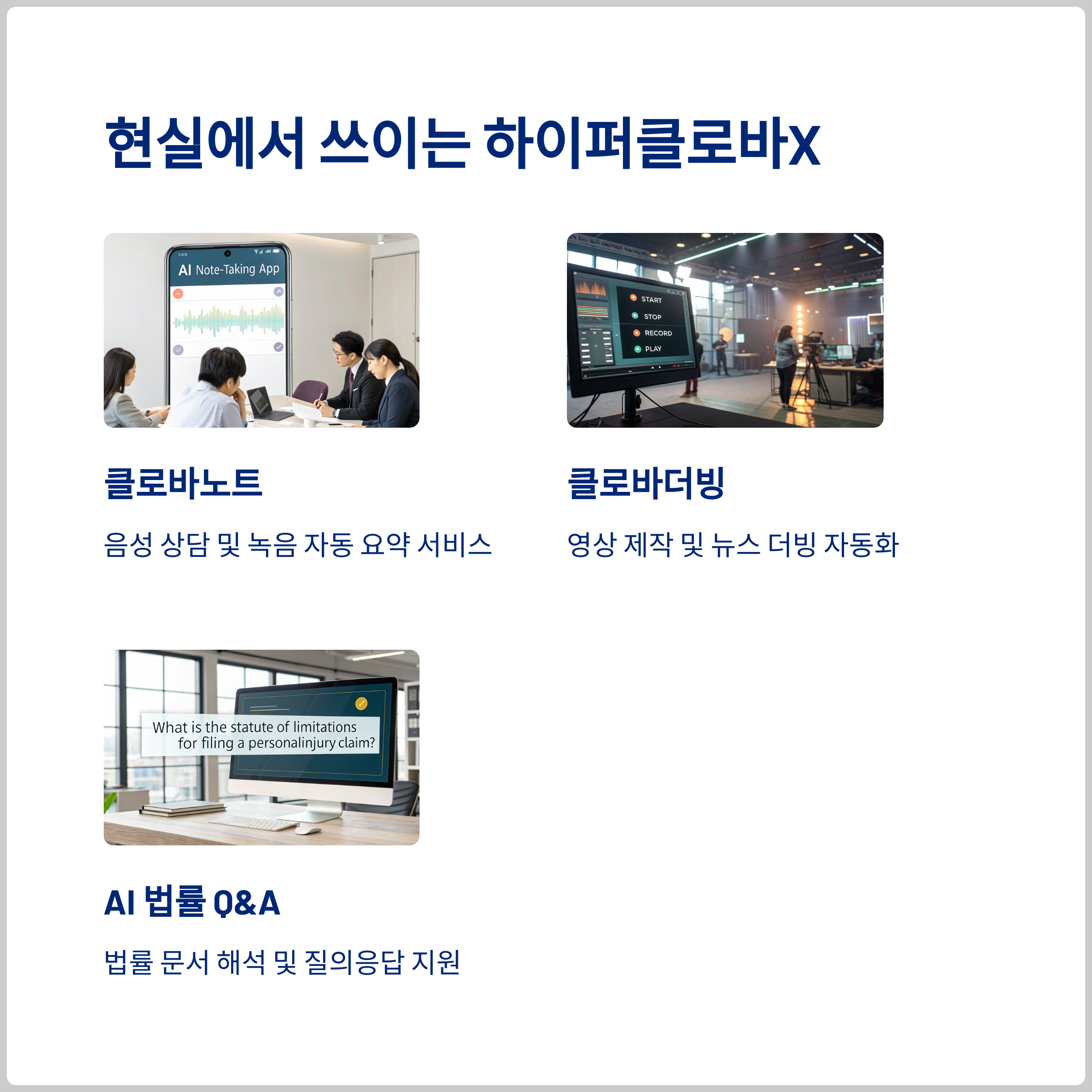 하이퍼클로바X는 다양한 서비스에 적용되어 현실적인 AI 활용을 보여주고 있습니다. 대표적으로는 ‘클로바노트’와 ‘클로바더빙’에 적용되어 음성 기반 상담이나 영상 콘텐츠 제작 등에 활용되고 있죠. 다음은 실제 활용 방식입니다: