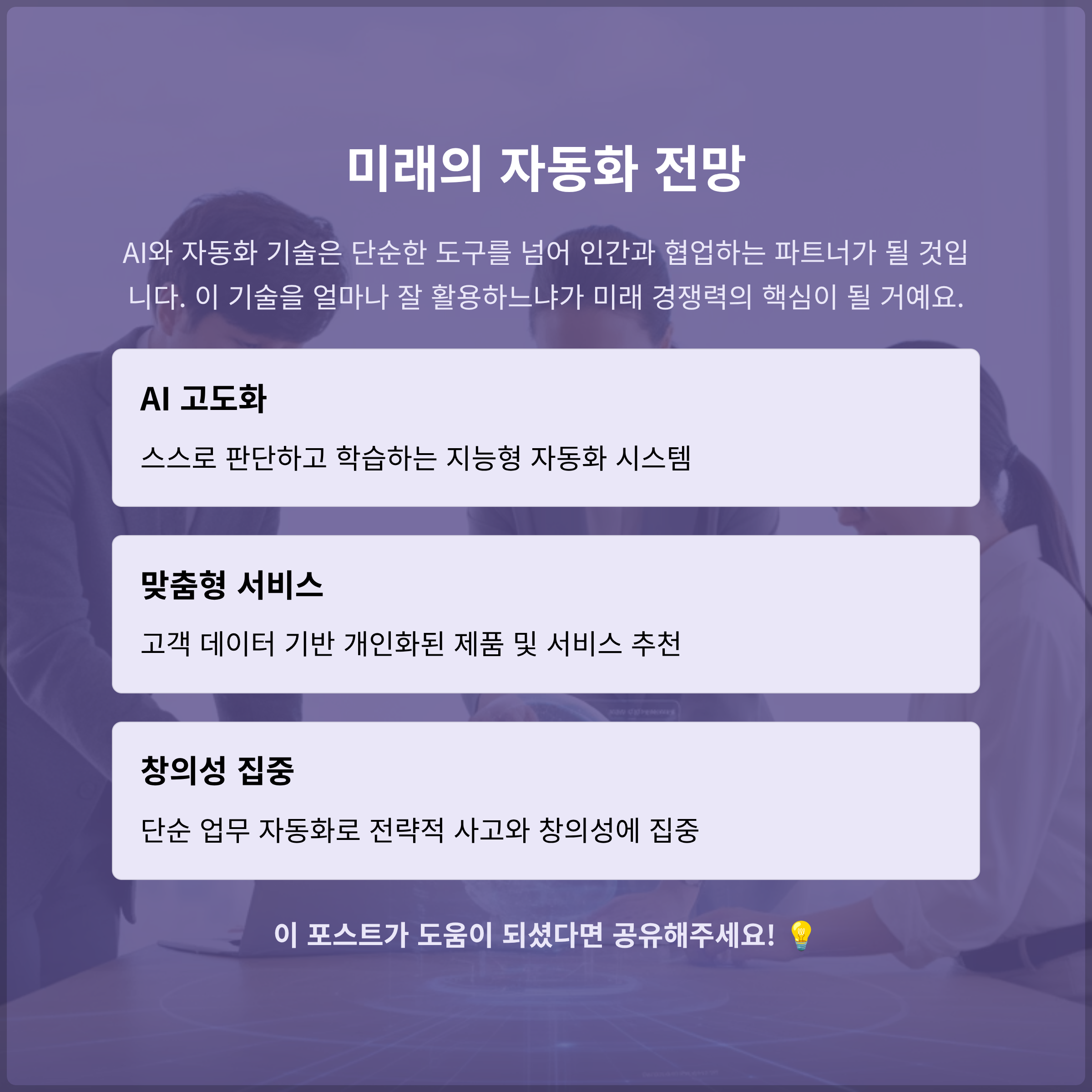 자동화 기술은 앞으로도 계속 발전할 것으로 보여요. 특히 AI의 발전과 함께 자동화는 더욱 고도화될 거예요. 단순히 반복 작업을 대체하는 것을 넘어, AI가 스스로 판단하고 학습하며 복잡한 의사결정을 지원하는 방향으로 나아갈 거예요.