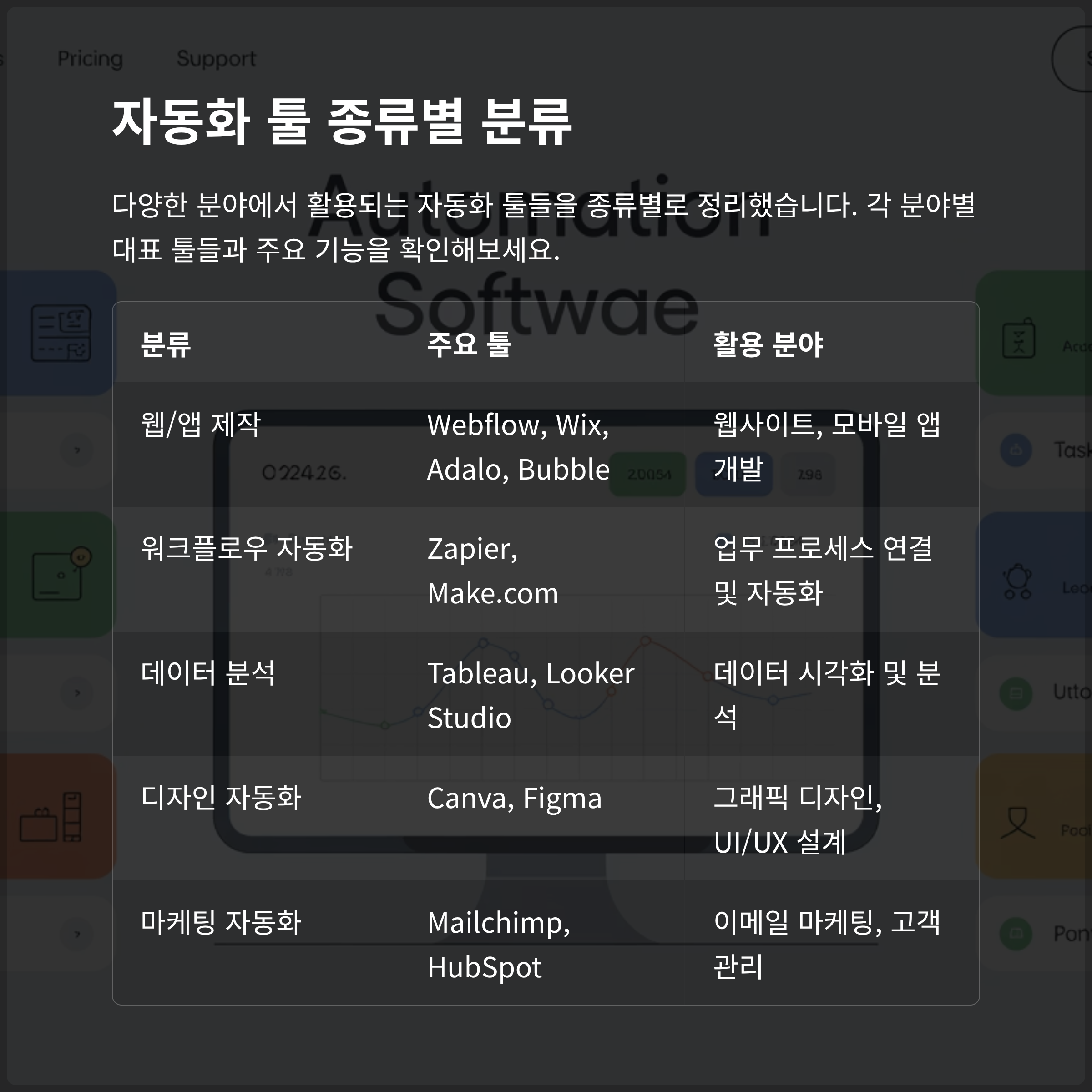 시중에 나와 있는 자동화 툴 종류는 매우 다양해요. 크게 분류하자면 다음과 같아요. 웹사이트 및 앱 제작을 위한 툴로는 'Webflow', 'Wix', 'Adalo', 'Bubble' 등이 있고요.
