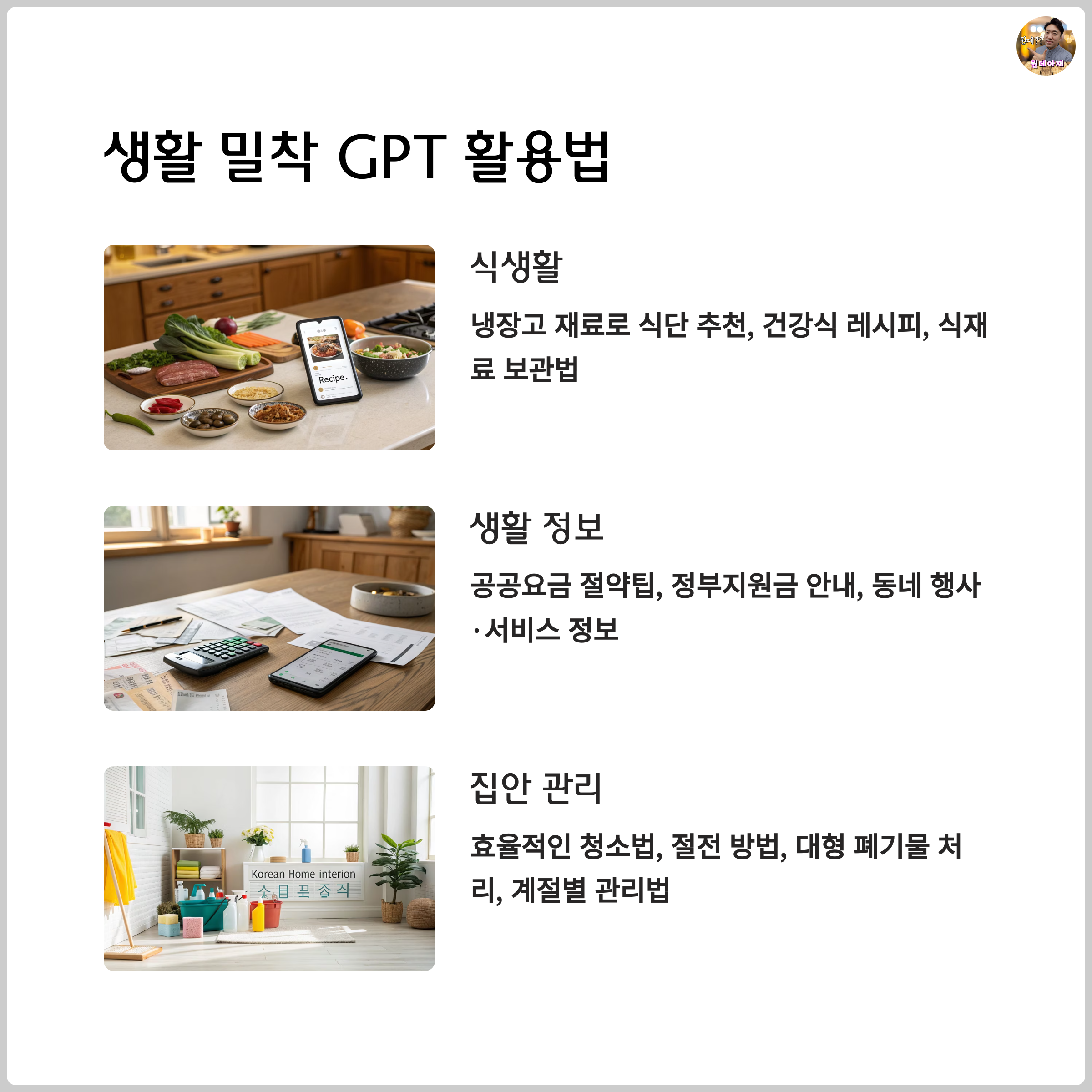 예를 들어, “에어프라이어 반찬 추천”, “김치찌개 맛있게 끓이는 법”, “냉장고 냄새 없애는 방법”처럼 요리와 청소, “세탁기 청소 방법”, “전기세 절약 요령” 같은 생활 팁도 빠르게 알려줍니다.