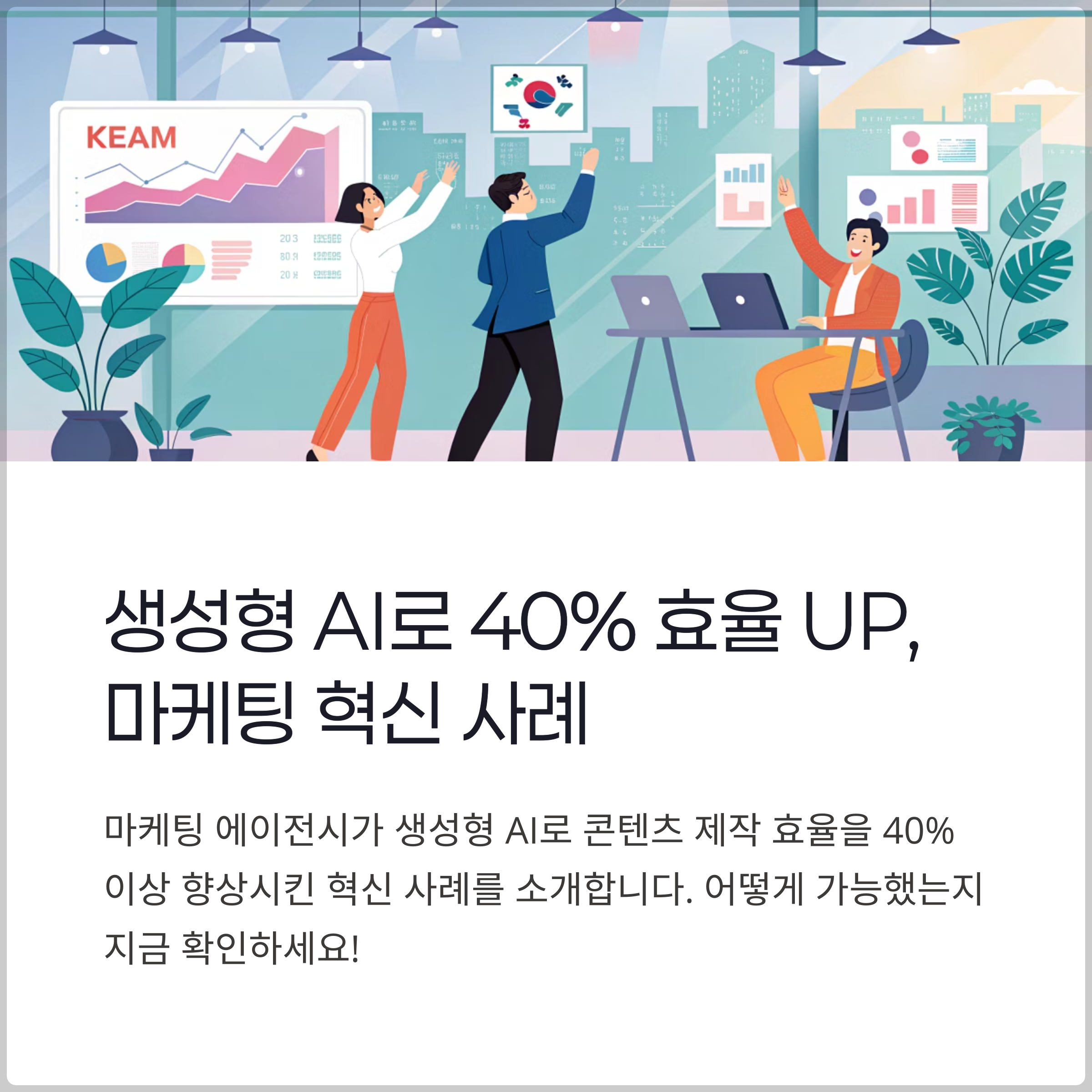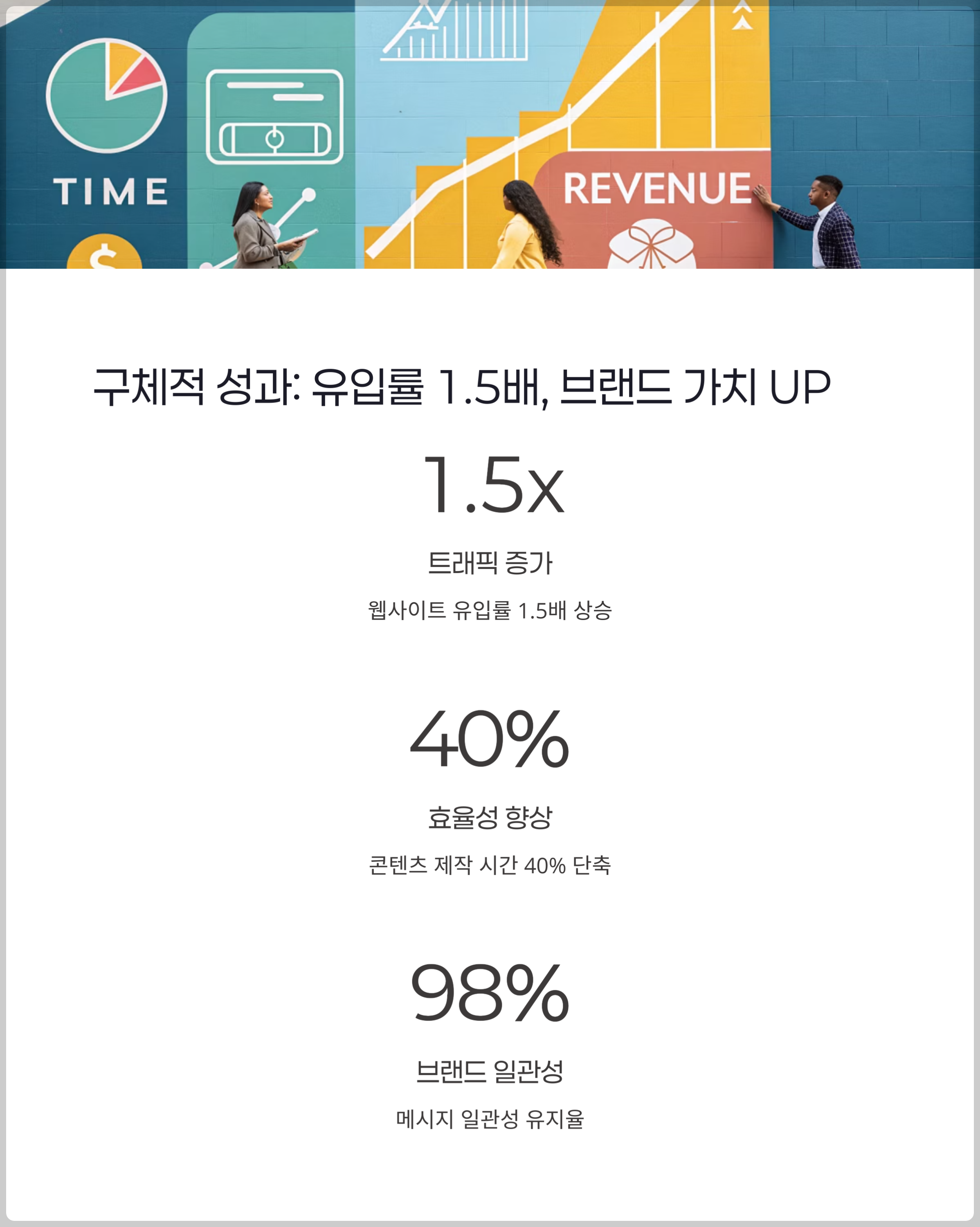 한 마케팅 에이전시는 생성형 AI를 통해 콘텐츠 제작 효율을 40% 이상 높였습니다. 주제 선정은 ChatGPT, 이미지 제작은 Midjourney, 교정은 Grammarly를 활용했으며, 최종 콘텐츠는 전문가가 리뷰하는 3단계 검수 시스템을 도입해 품질을 확보했습니다. 그 결과, 유입률은 기존 대비 1.5배 증가했고, 브랜드 일관성도 유지할 수 있었습니다.