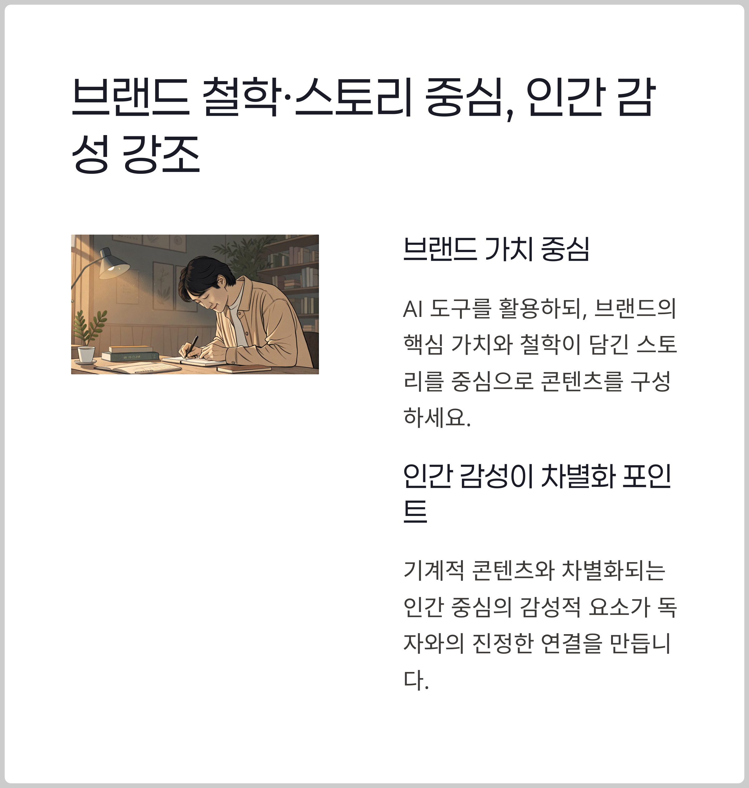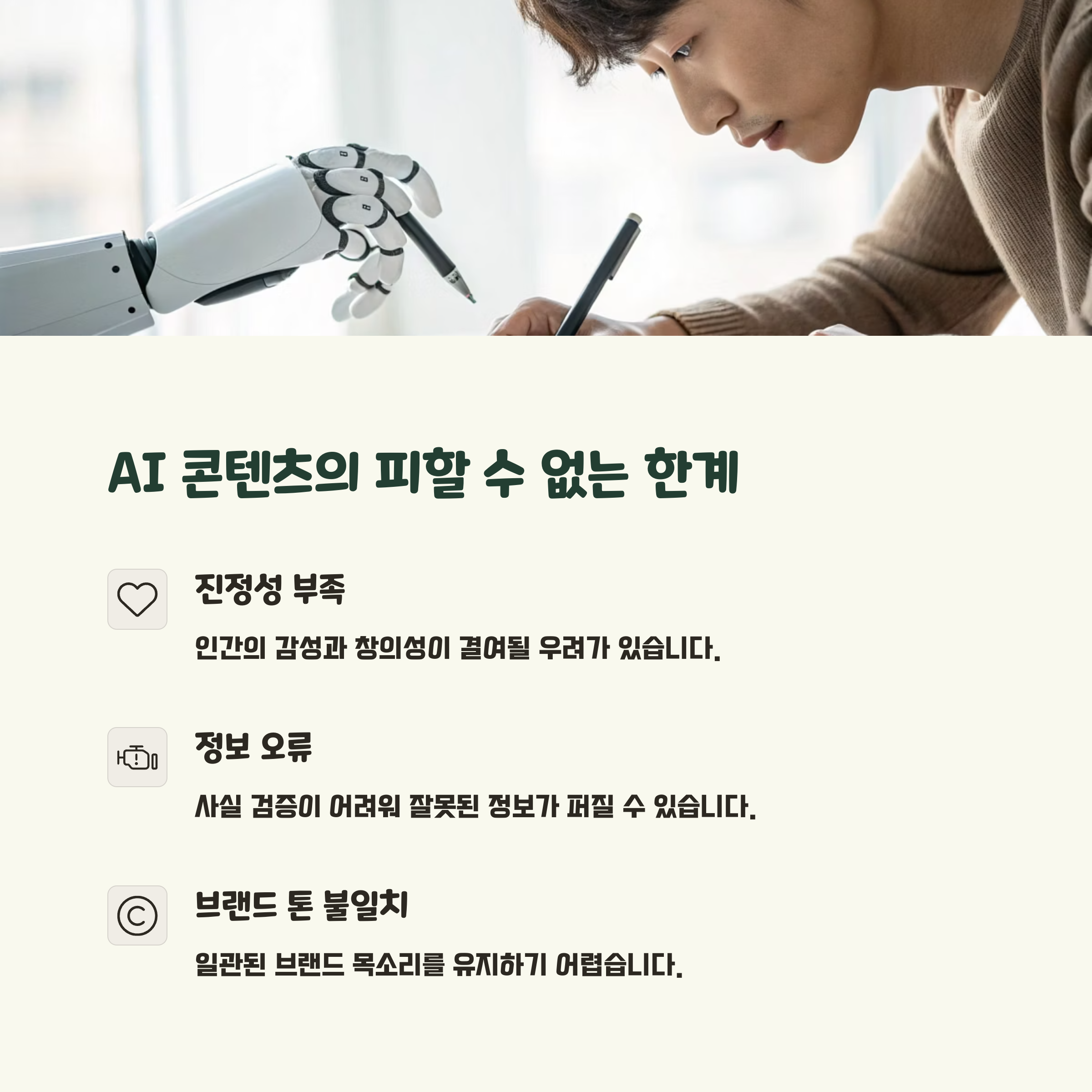 | 한계 | 진정성 부족, 오류 가능성, 브랜드 톤 일관성 저하 |