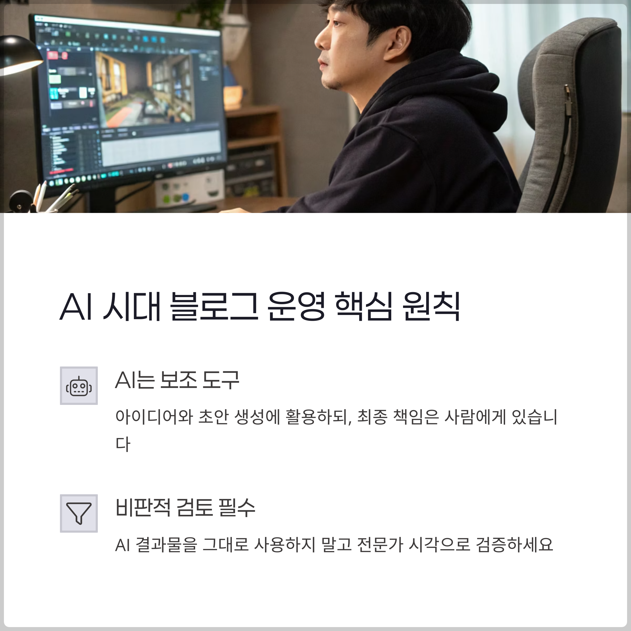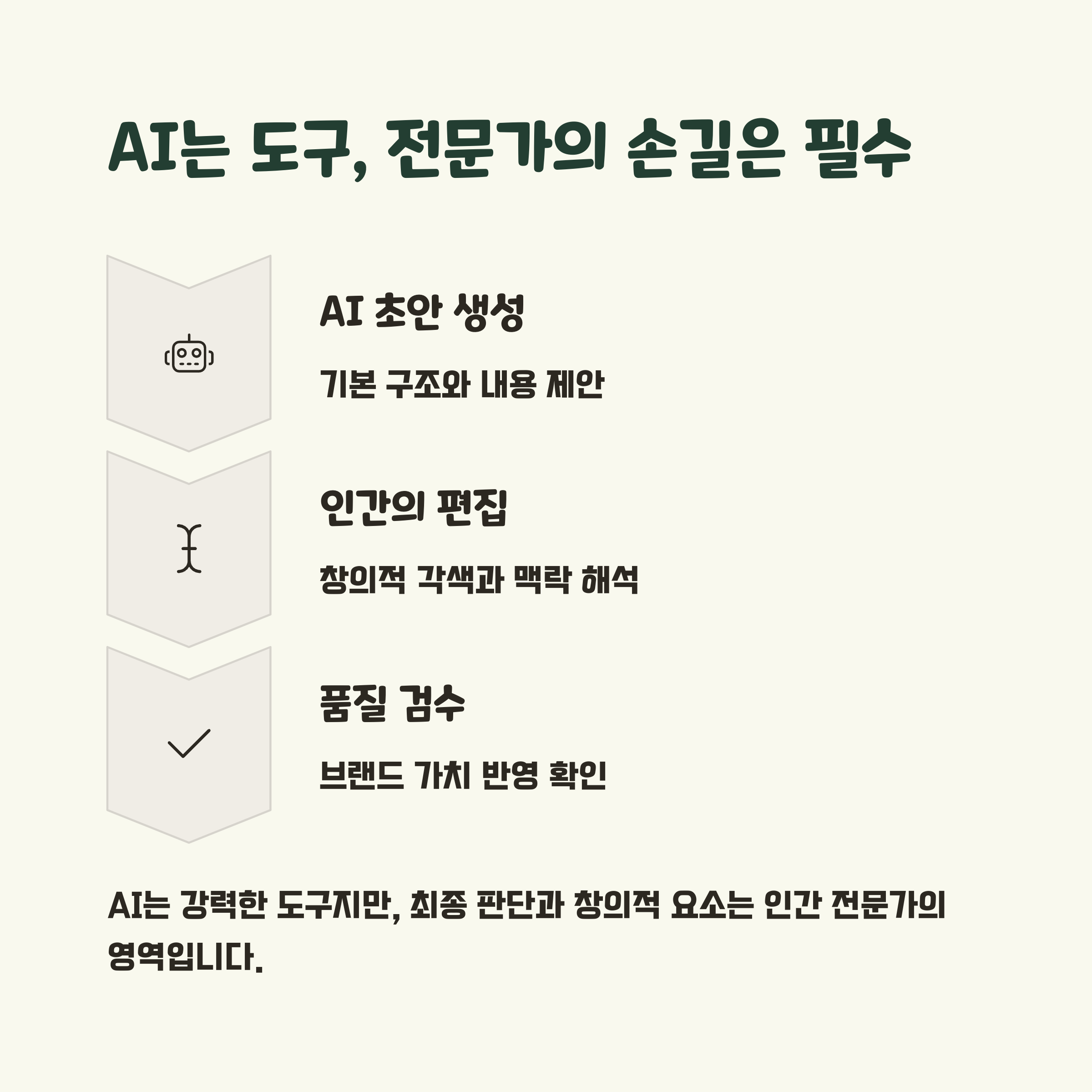 - AI는 보조 도구일 뿐, 콘텐츠 품질의 최종 책임은 사람에게 있음