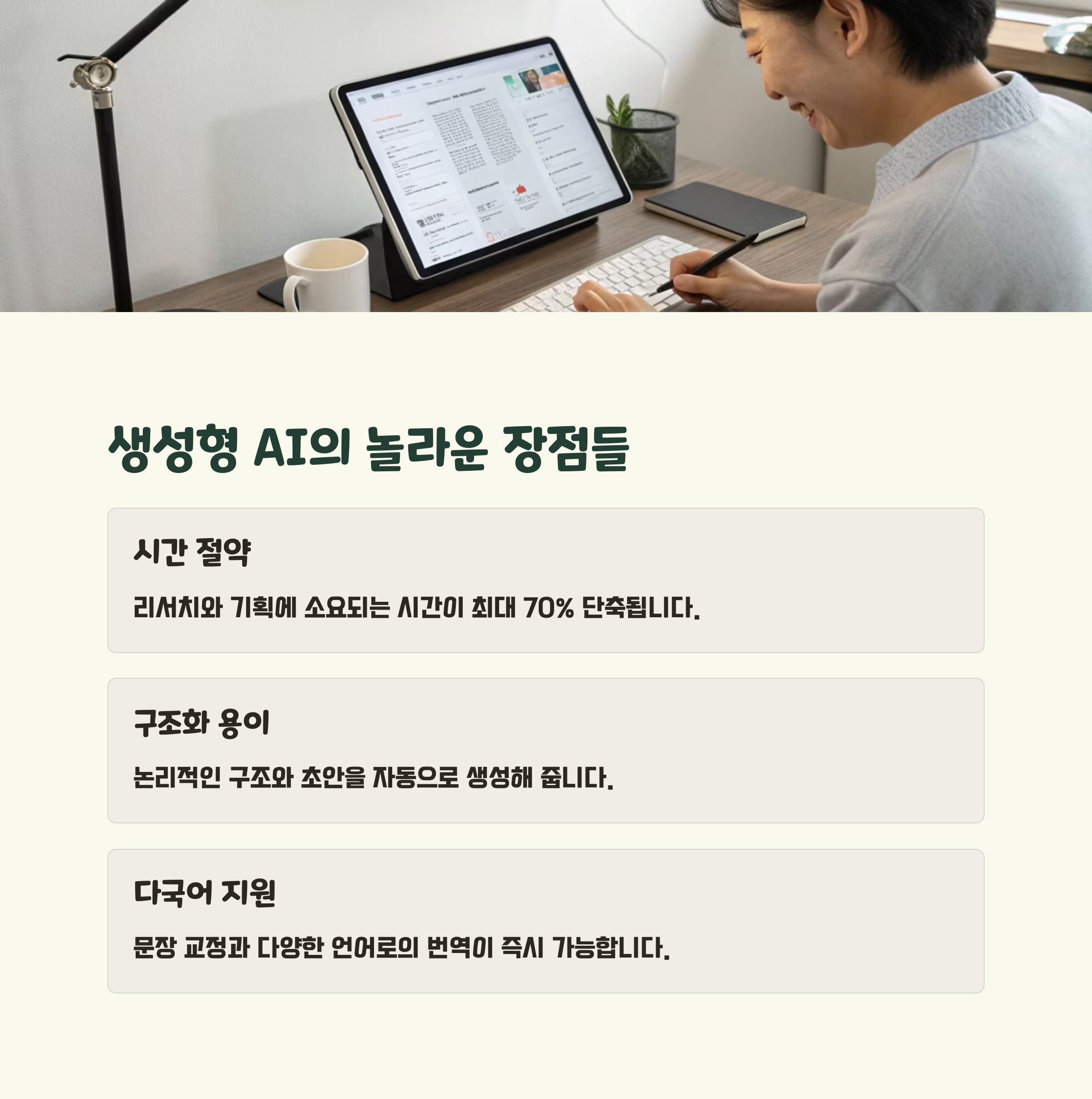 | 장점 | 리서치 시간 단축, 콘텐츠 구조화 용이, 문장 교정과 표현 다양성 확보 |