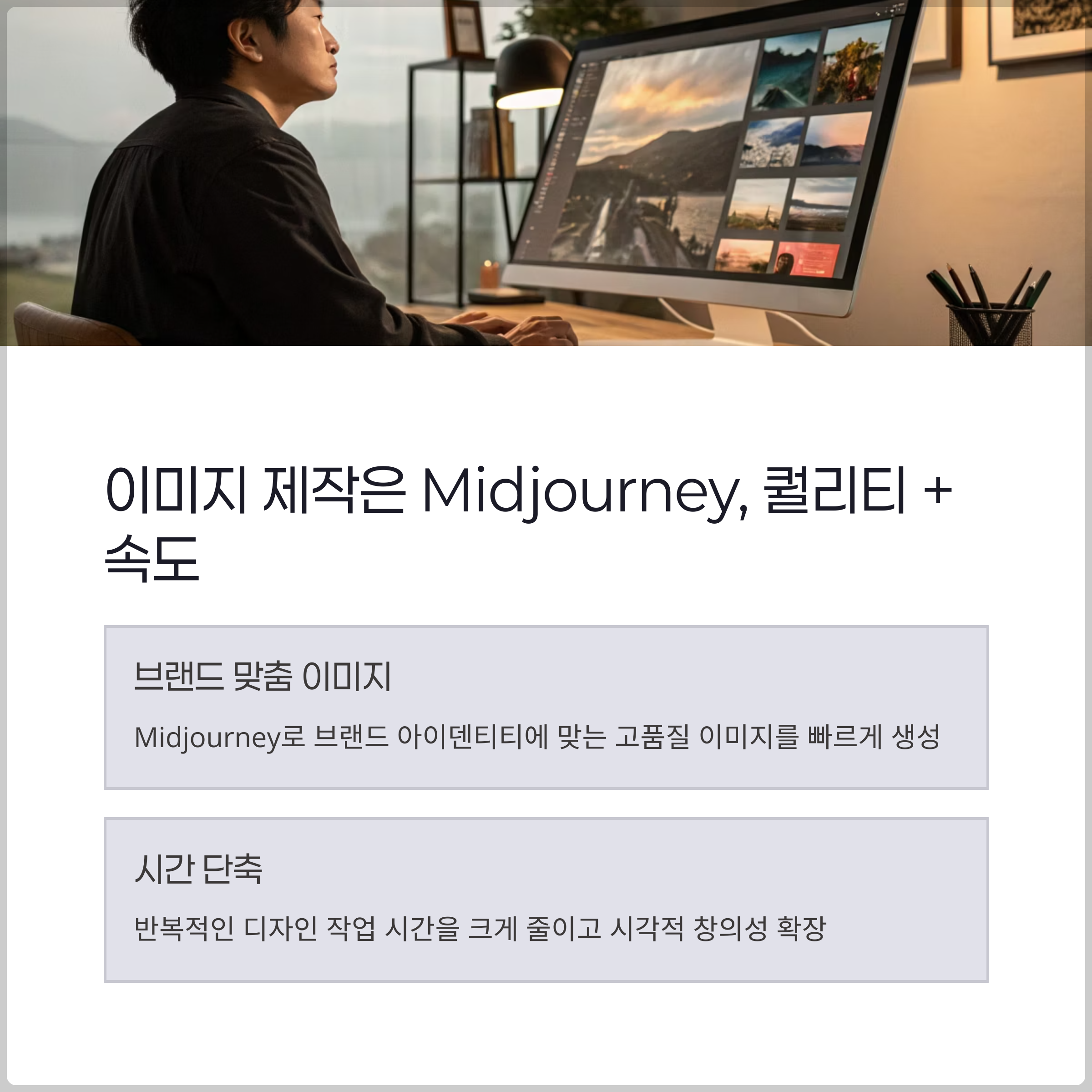 | Midjourney | AI 이미지 생성 | 블로그 삽화 및 썸네일 제작 |