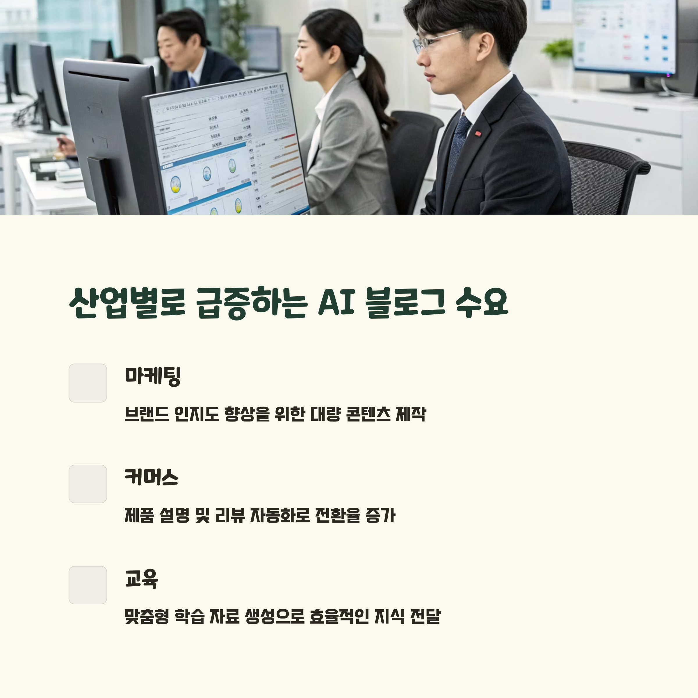 2025년 현재, ChatGPT, Claude, Gemini 등 다양한 생성형 AI 기술이 상용화되면서, 블로그 콘텐츠 제작 방식에 큰 전환점이 생겼습니다. 텍스트 작성뿐 아니라 이미지, 요약, 번역, 일정 관리까지 AI가 도와주는 시대가 된 것이죠. 특히 마케팅, 커머스, 교육 분야에서 블로그 자동화 도구 수요가 급증하며, AI 기반 콘텐츠는 이제 ‘선택’이 아닌 ‘필수’로 자리 잡고 있습니다.