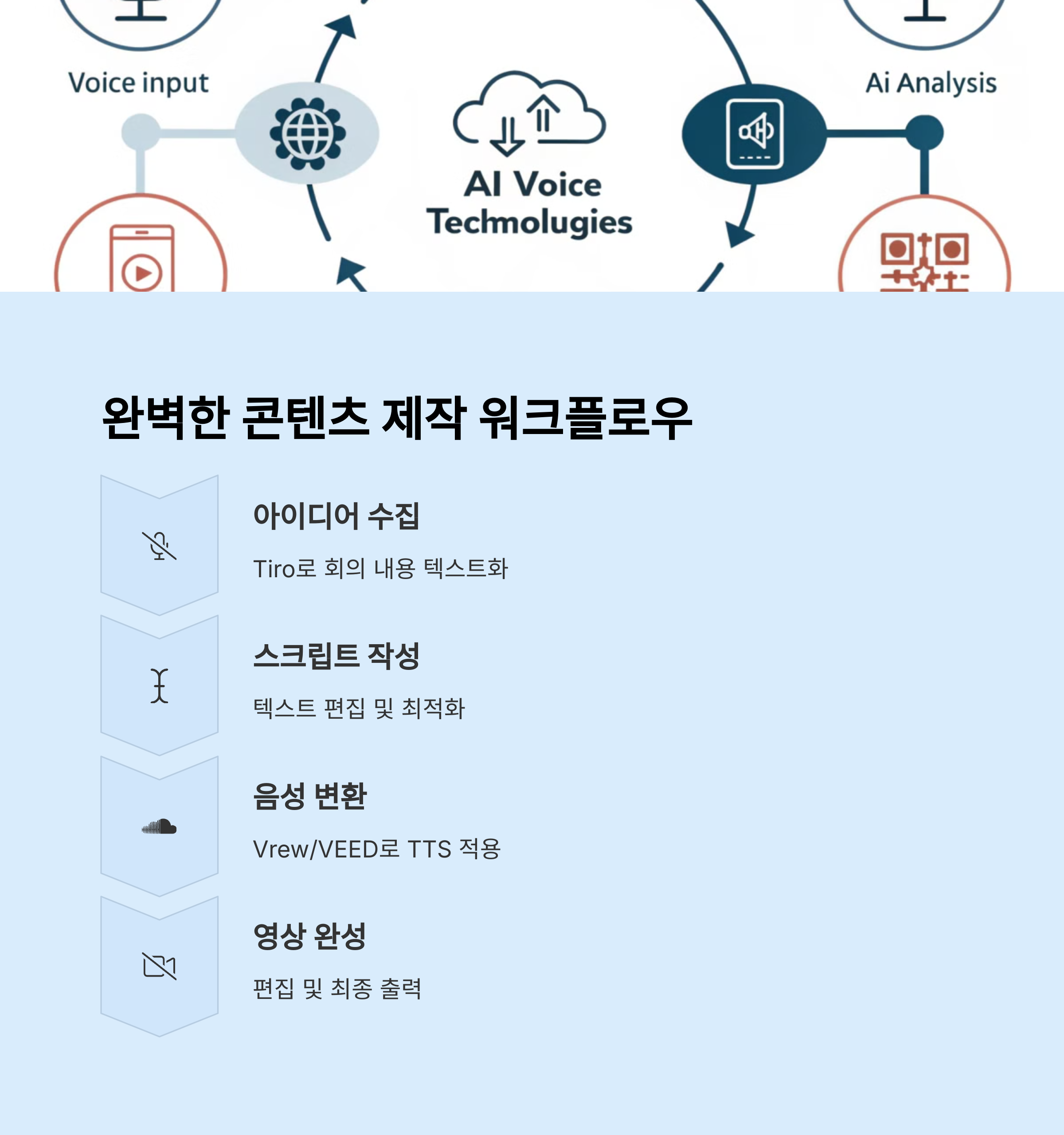이 두 영역을 결합하면 회의 내용을 자동으로 텍스트로 정리하고, 그것을 기반으로 한 설명 영상까지 한 번에 제작할 수 있게 됩니다.
