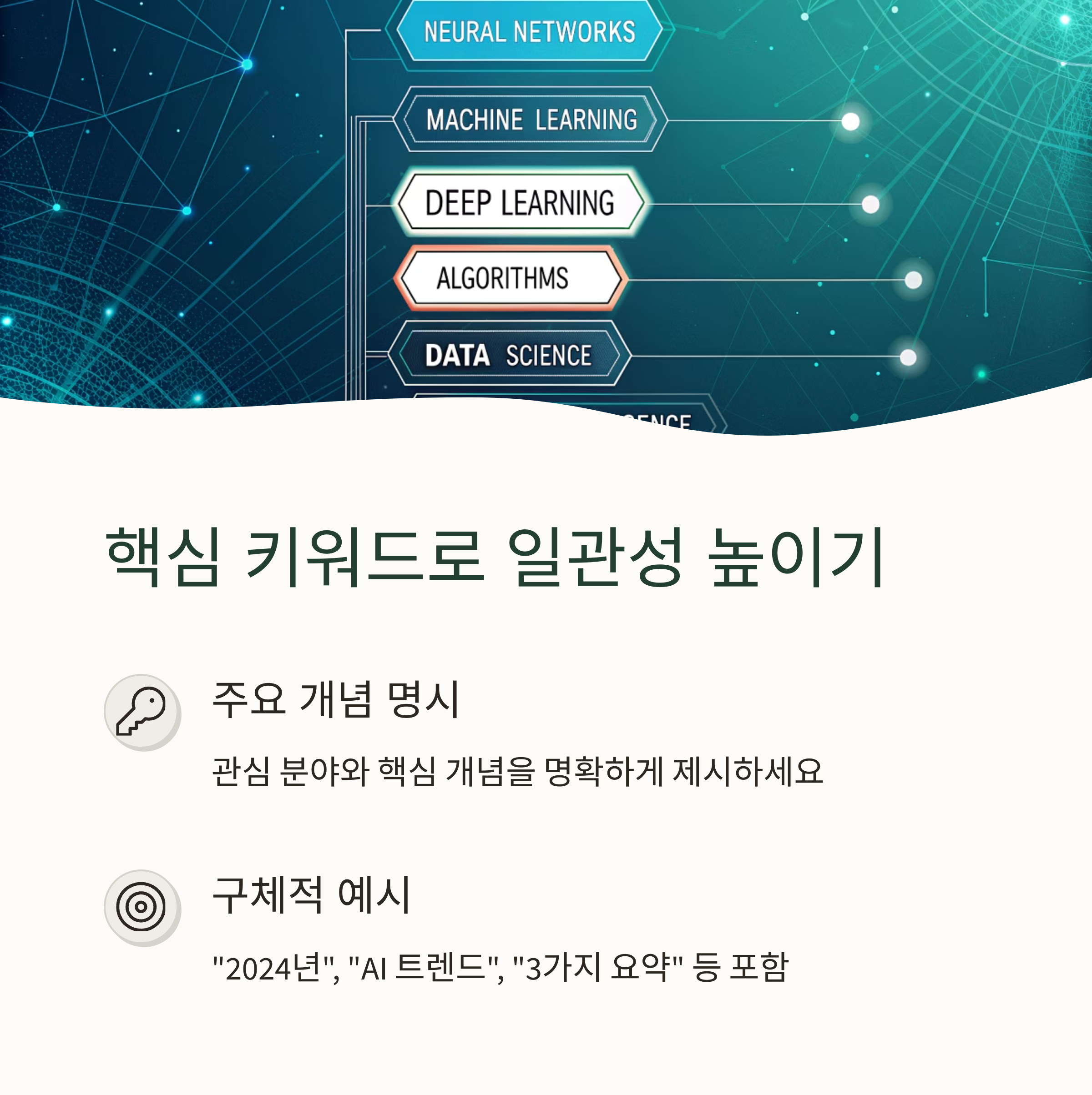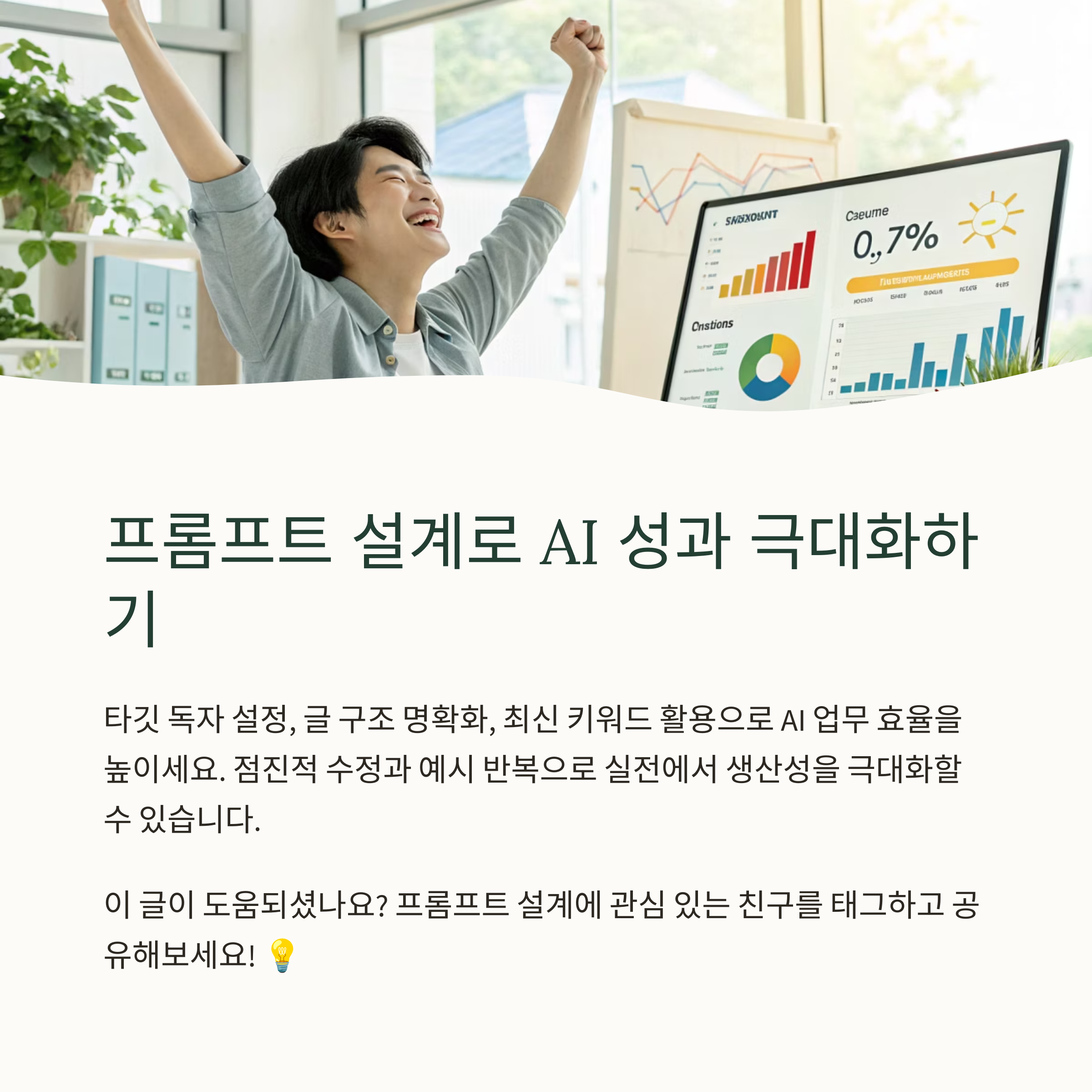 AI를 잘 활용하는 사람과 그렇지 못한 사람의 차이는 '프롬프트'에서 시작됩니다. 블로그의 품질, SEO 성과, 콘텐츠 생산성까지 좌우하는 이 기술은 이제 선택이 아닌 필수가 되었죠. 지금 당장 한 줄의 프롬프트에 전략을 더해보세요. 여러분의 콘텐츠가 놀랍도록 달라질 수 있습니다! 😊 댓글로 여러분만의 프롬프트 노하우나 궁금한 점을 남겨주세요. 함께 성장해 나가요!