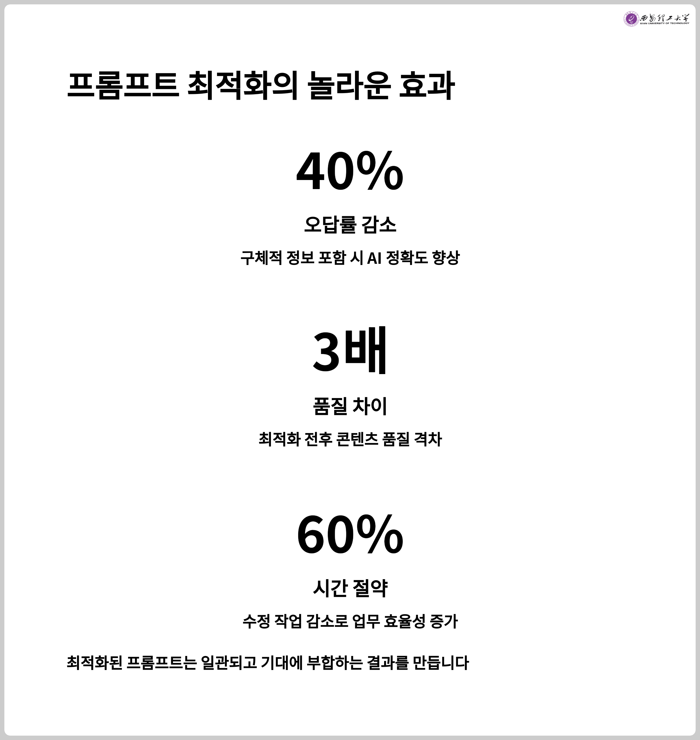 프롬프트 최적화는 블로그 콘텐츠의 질을 비약적으로 향상시킵니다. 아래의 표는 프롬프트 수준에 따른 콘텐츠 품질의 차이를 요약한 것입니다.