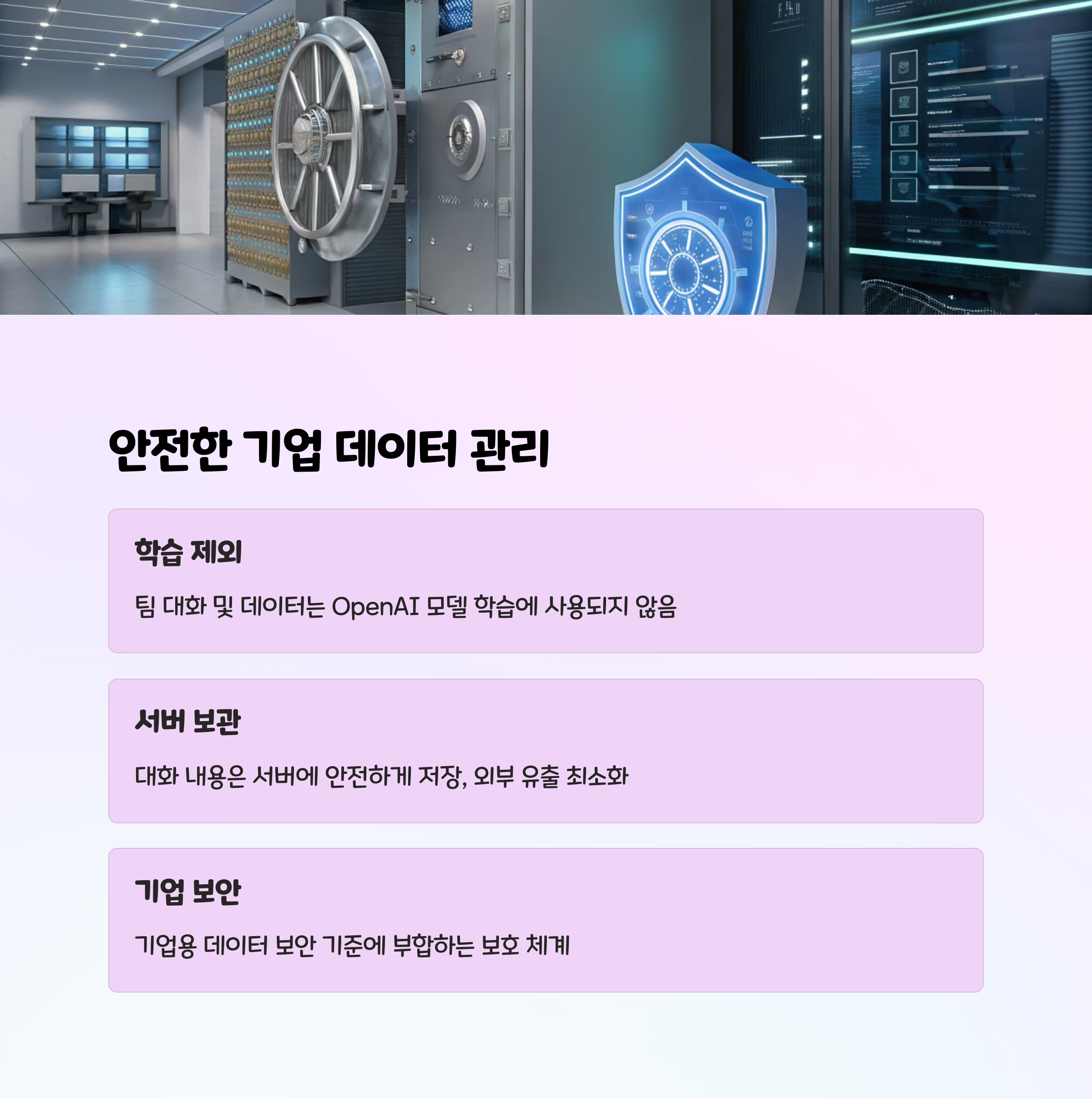 팀 플랜에서는 사용자의 대화 데이터가 ChatGPT 모델 학습에 사용되지 않으며, 이는 기업 고객이 가장 우려하는 보안 문제를 어느 정도 해소합니다.