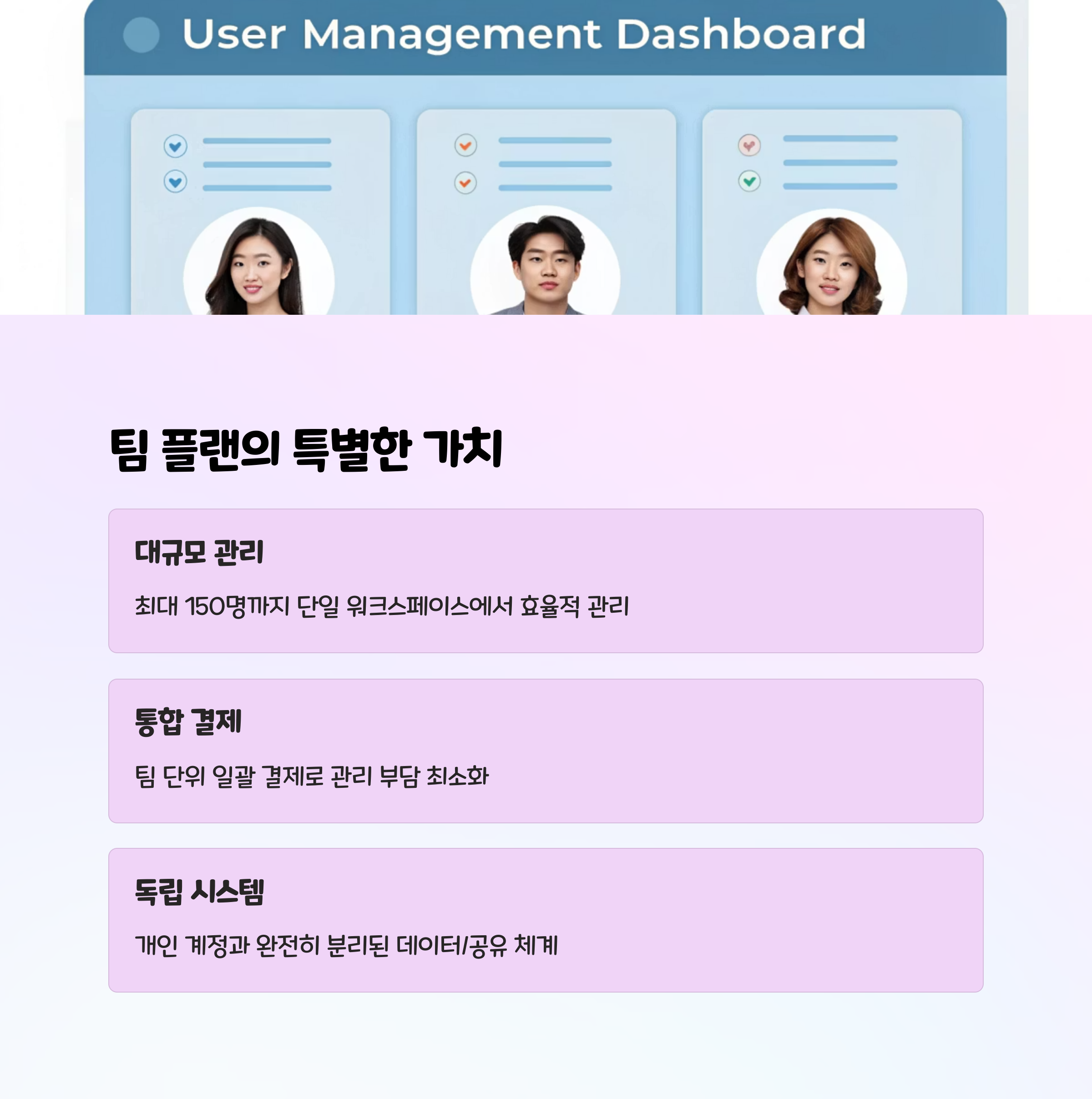 - 엔터프라이즈 플랜: 150명 이상 대규모 조직, 더 강력한 보안과 API 기반 확장 가능