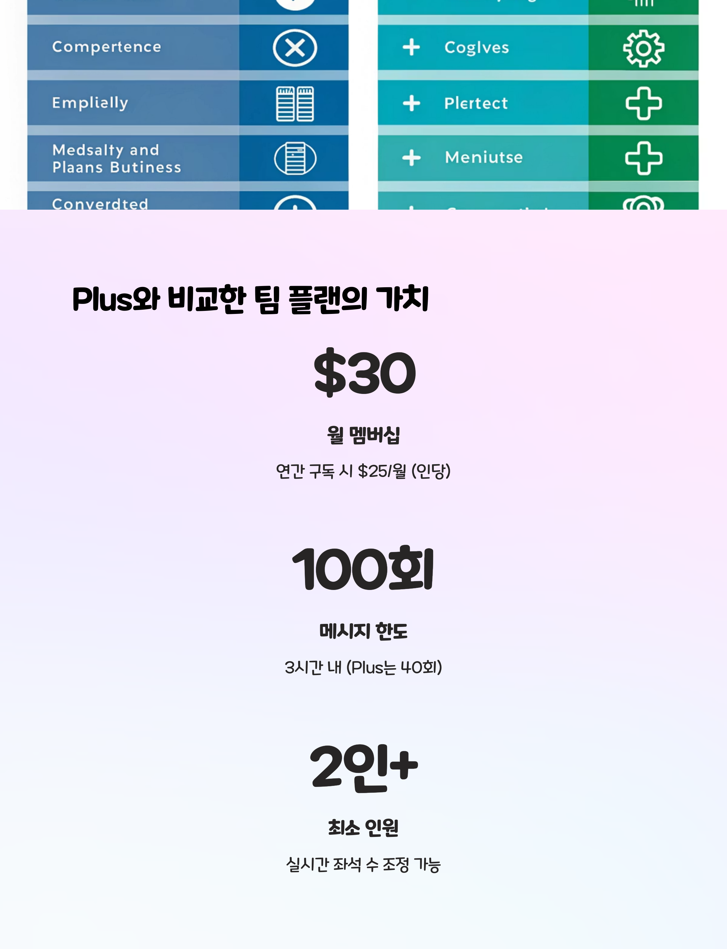 기존의 Plus 플랜이 개인 사용자 중심이라면, 팀 플랜은 여러 명이 각각의 계정으로 GPT 기능을 활용할 수 있는 점이 가장 큰 차이입니다.