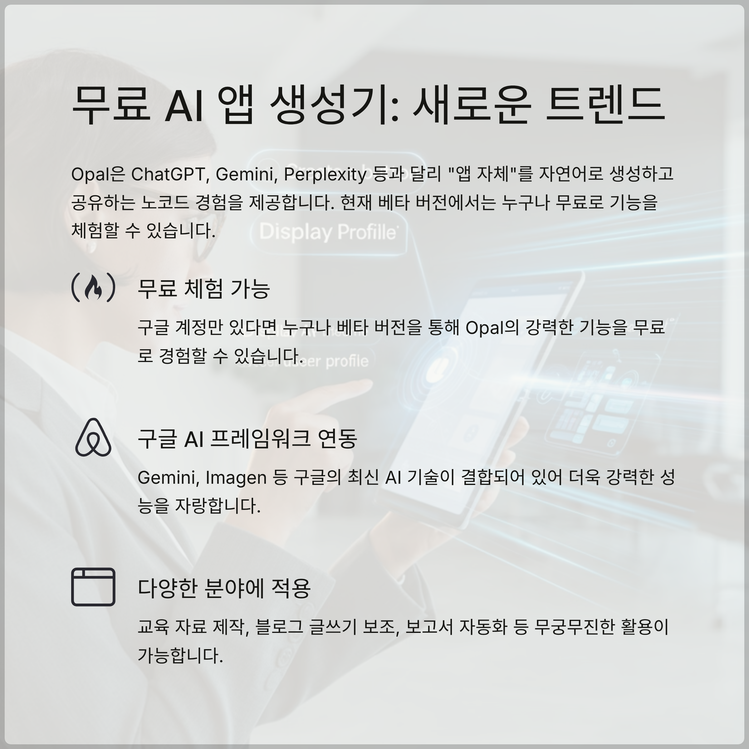 - 무료 체험 가능: 구글 계정만 있다면 누구나 베타 버전을 통해 Opal의 강력한 기능을 무료로 경험할 수 있습니다.