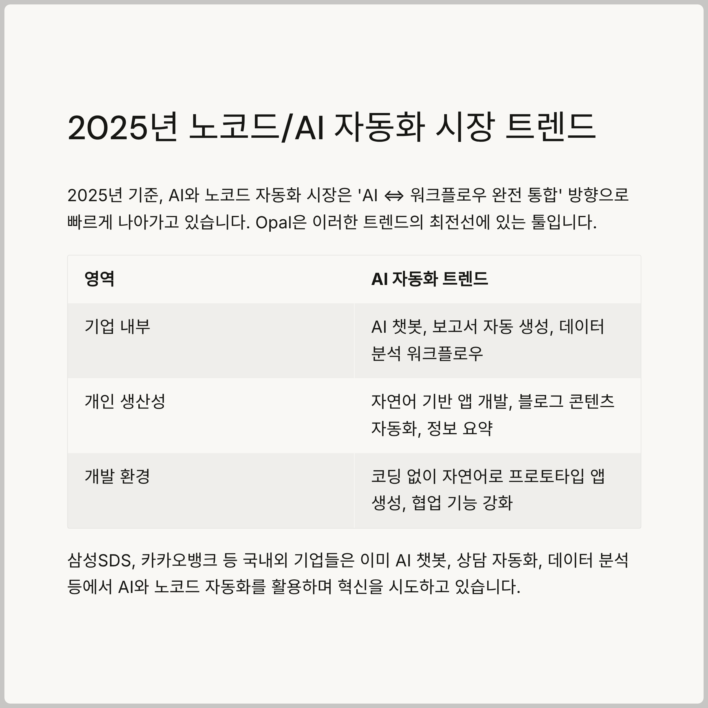 Opal은 현재 베타 단계이지만, 유사한 AI 기반 노코드 자동화 트렌드는 이미 다양한 기업에서 실제 도입되고 있습니다. 삼성SDS, 카카오뱅크 등 국내외 기업들은 AI 챗봇, 상담 자동화, 데이터 분석 등에서 AI와 노코드 자동화를 활용하며 혁신을 시도하고 있습니다. 이는 Opal이 제시하는 미래가 단순한 이론이 아니라 현실적인 가능성임을 보여줍니다.