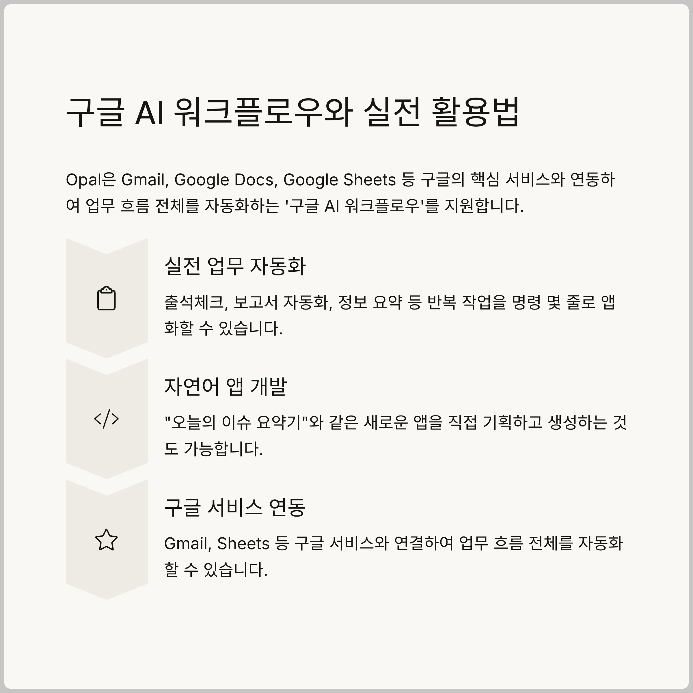 Opal은 Gmail, Google Docs, Google Sheets 등 구글의 핵심 서비스와 연동하여 업무 흐름 전체를 자동화하는 '구글 AI 워크플로우'를 지원합니다. 이를 통해 반복적인 작업을 최소화하고, 생산성을 극대화할 수 있습니다.
