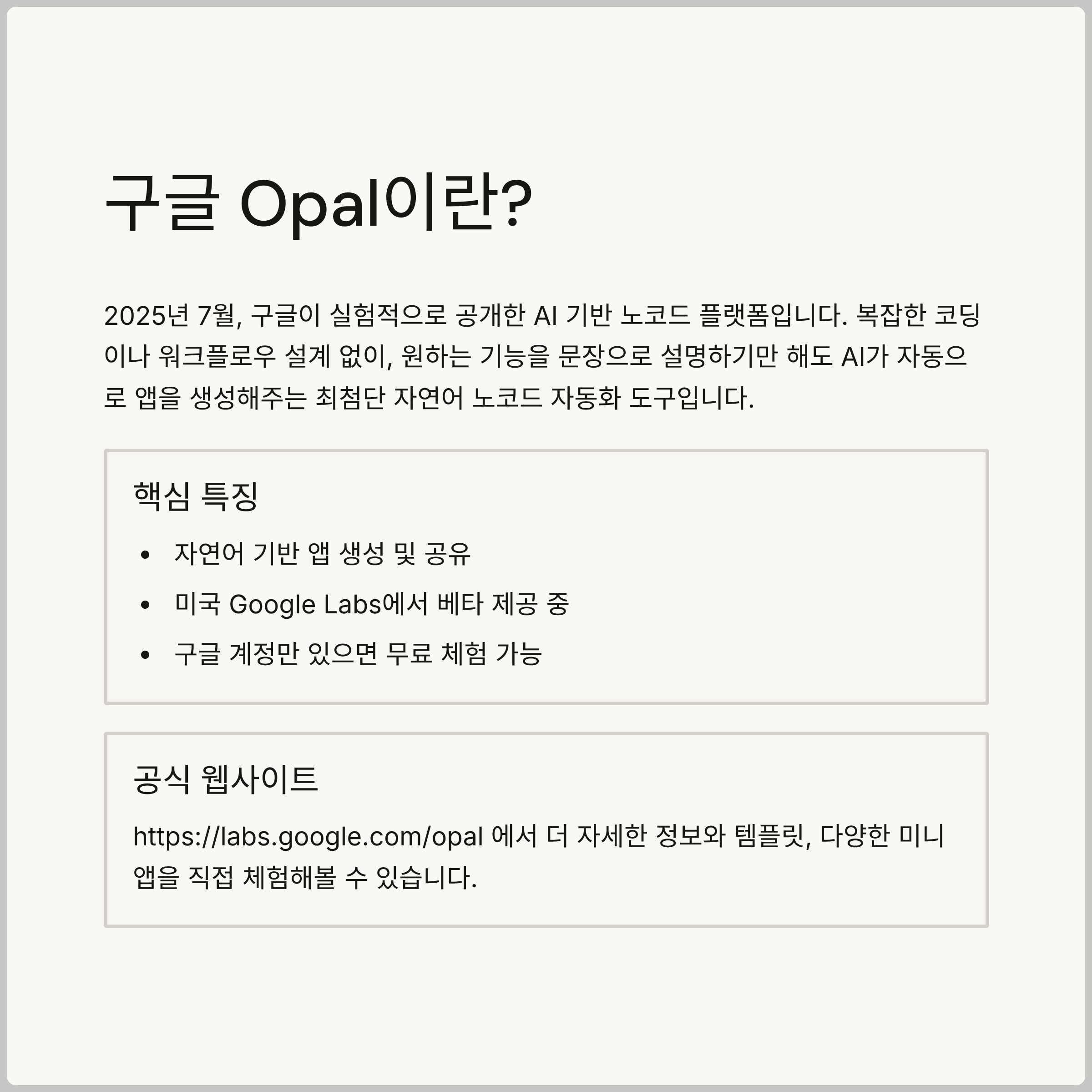 - 무료 체험 가능: 구글 계정만 있다면 누구나 베타 버전을 통해 Opal의 강력한 기능을 무료로 경험할 수 있습니다.