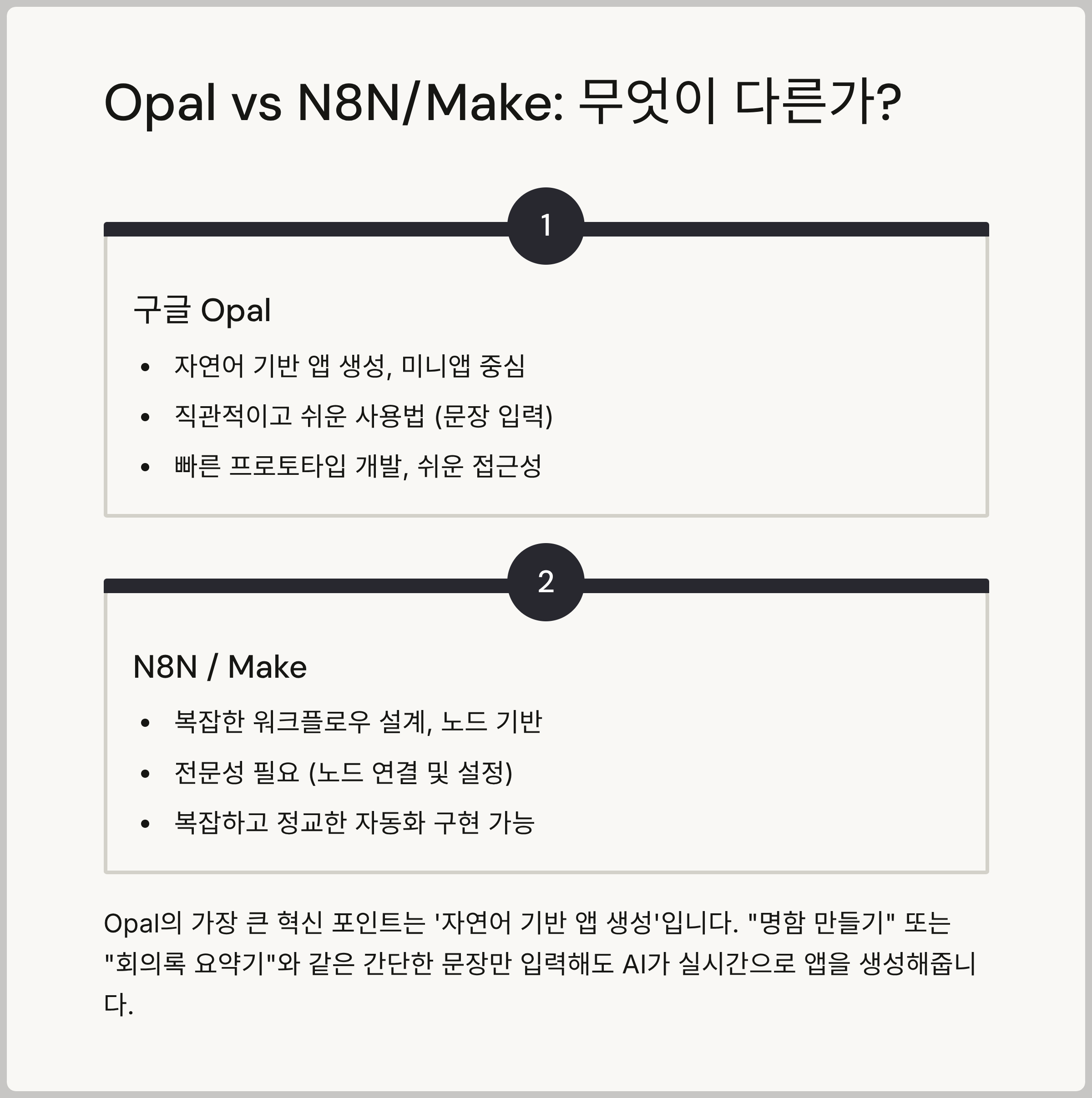 Opal은 특히 자연어로 앱을 생성하고 빠르게 프로토타입을 만들 때 유용합니다. 기존 툴들이 복잡하고 정교한 워크플로우에 특화된 반면, Opal은 직관적인 사용 경험에 초점을 맞추고 있습니다. 두 툴을 보완적으로 사용하는 것도 좋은 방법입니다.