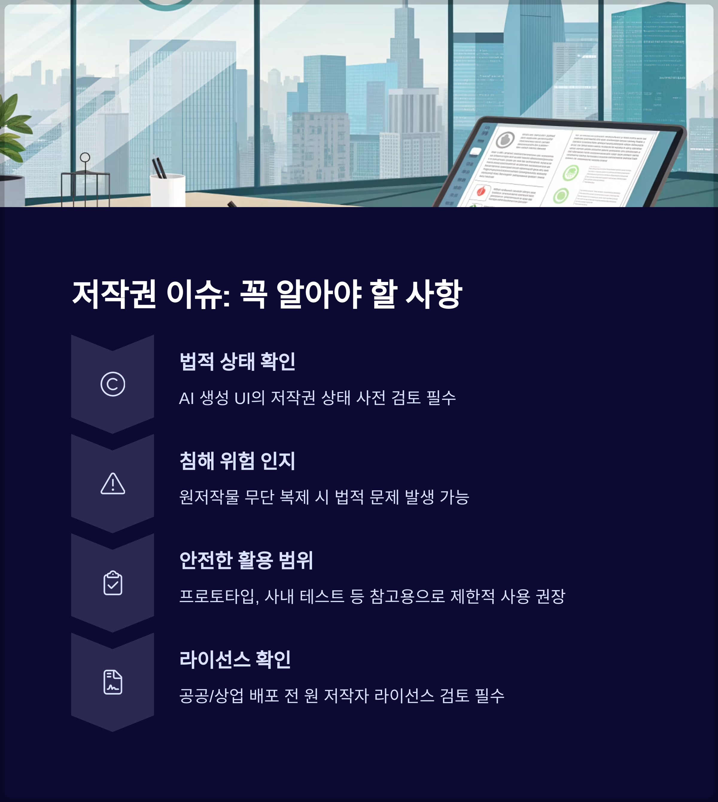 순수 AI 출력물 자체에는 저작권이 없지만, 원본 웹사이트의 디자인에 대한 저작권은 여전히 존재합니다. 따라서 상업적 이용을 위해서는 복제된 UI를 독자적인 디자인으로 충분히 변형하거나, 원본 사이트의 저작권 정책을 확인하고 필요한 경우 라이선스를 획득해야 합니다. 개인 학습 목적으로는 자유롭게 활용 가능합니다.