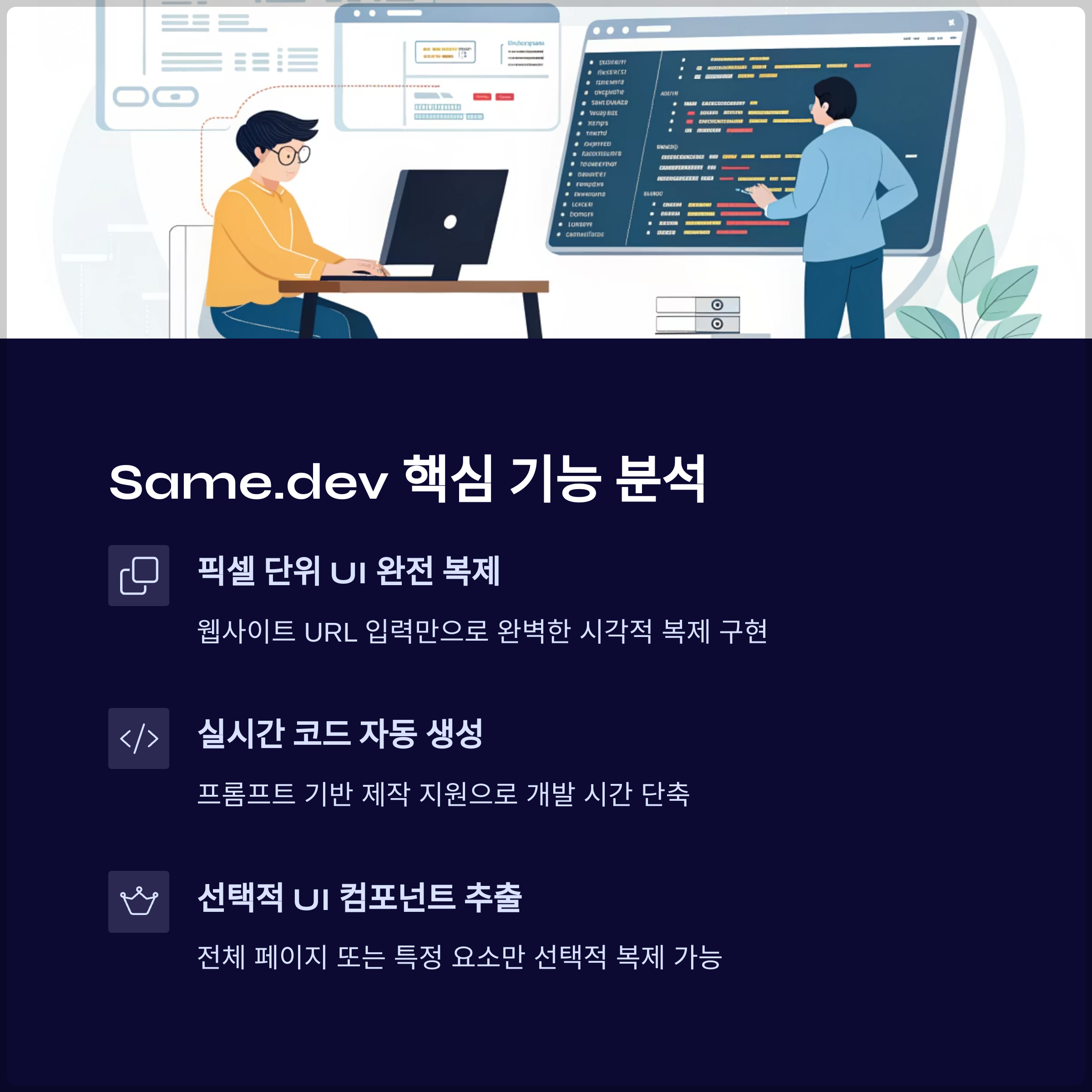 same.dev 사용법, AI 웹 UI 복제, 픽셀 단위 UI 복제, React 코드 자동 변환, 부분 UI 복제, 웹사이트 구조 분석, 동적 요소 한계, 저작권, 실전 적용, 도구 비교까지 한 번에!