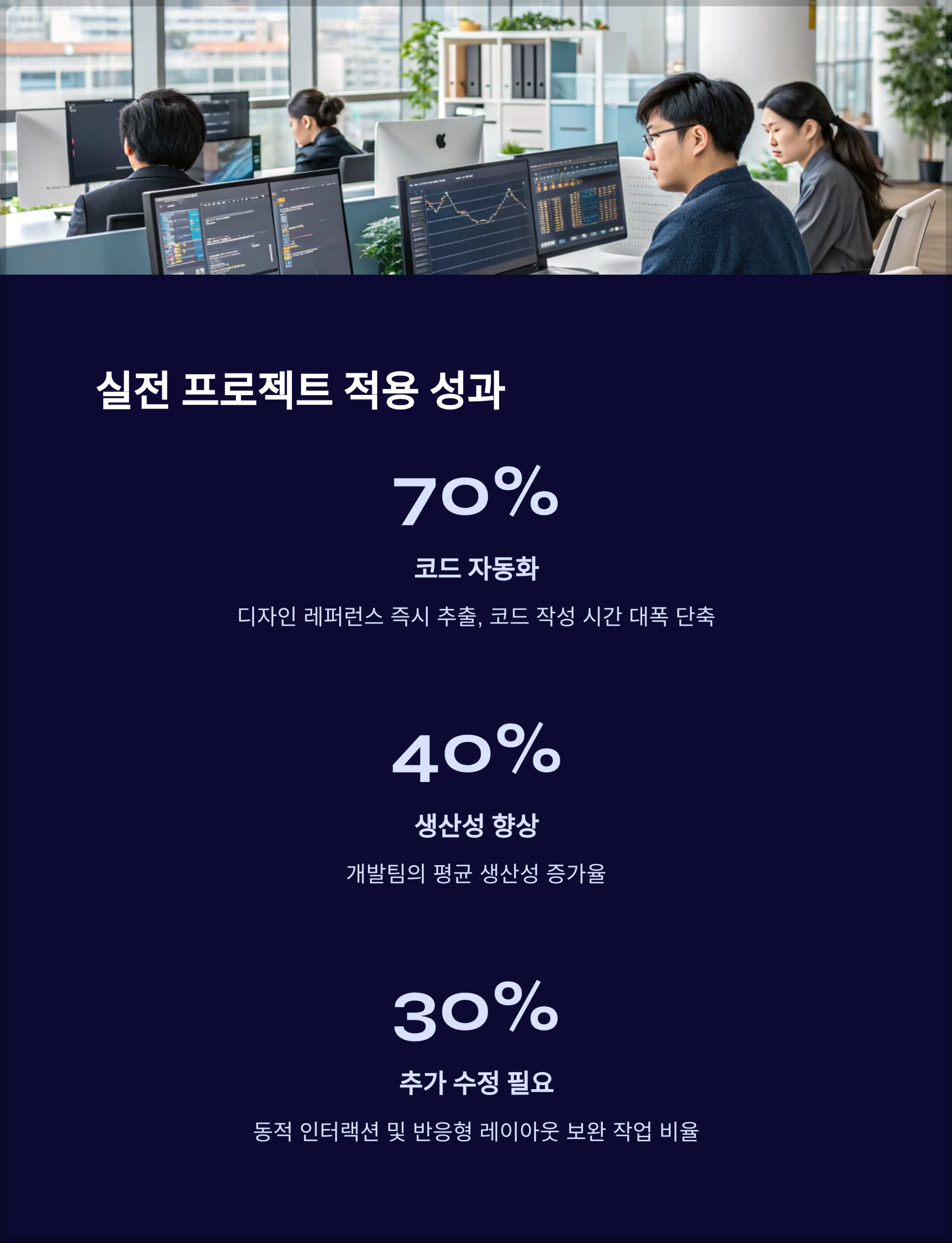 - 동적 요소 처리의 한계: 자바스크립트를 통해 실시간으로 변경되는 UI 요소나 복잡한 애니메이션은 AI가 정확히 분석하고 코드로 변환하기 어렵습니다.