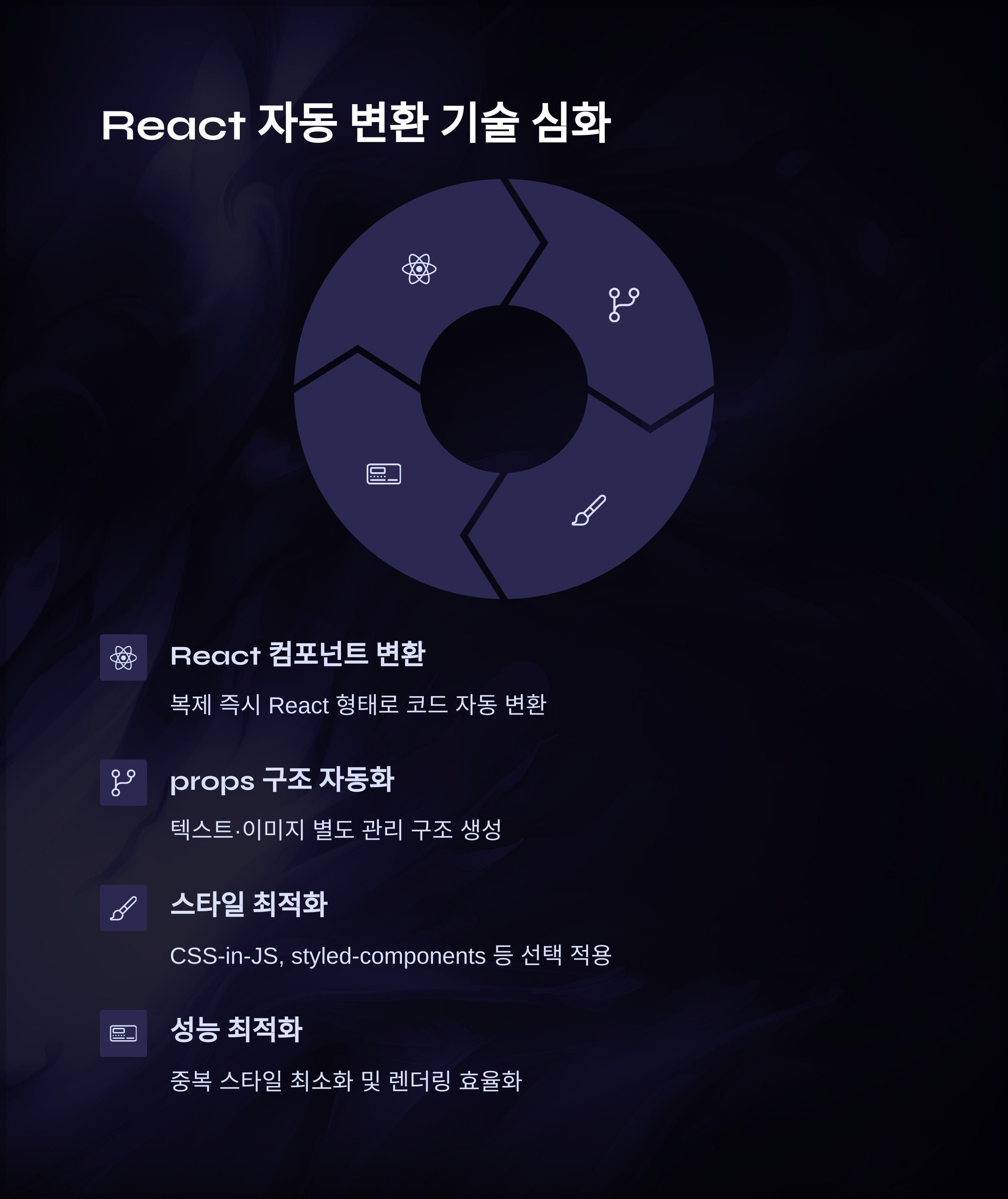 가장 주목할 만한 기능은 props 자동 생성입니다. 복제된 컴포넌트에 useState, useEffect 훅을 자동으로 장착하여, 상태 관리 및 부수 효과 처리를 위한 기본적인 구조를 제공합니다. 이는 개발자가 수동으로 작성해야 할 초기 설정 시간을 대폭 줄여줍니다. 또한, 스타일시트 최적화 기능도 제공하여 CSS-in-JS 변환 시 Tailwind와 Styled Components 중 원하는 옵션을 선택할 수 있도록 합니다. 이를 통해 기존 프로젝트의 스타일링 방식에 맞춰 유연하게 적용할 수 있습니다.