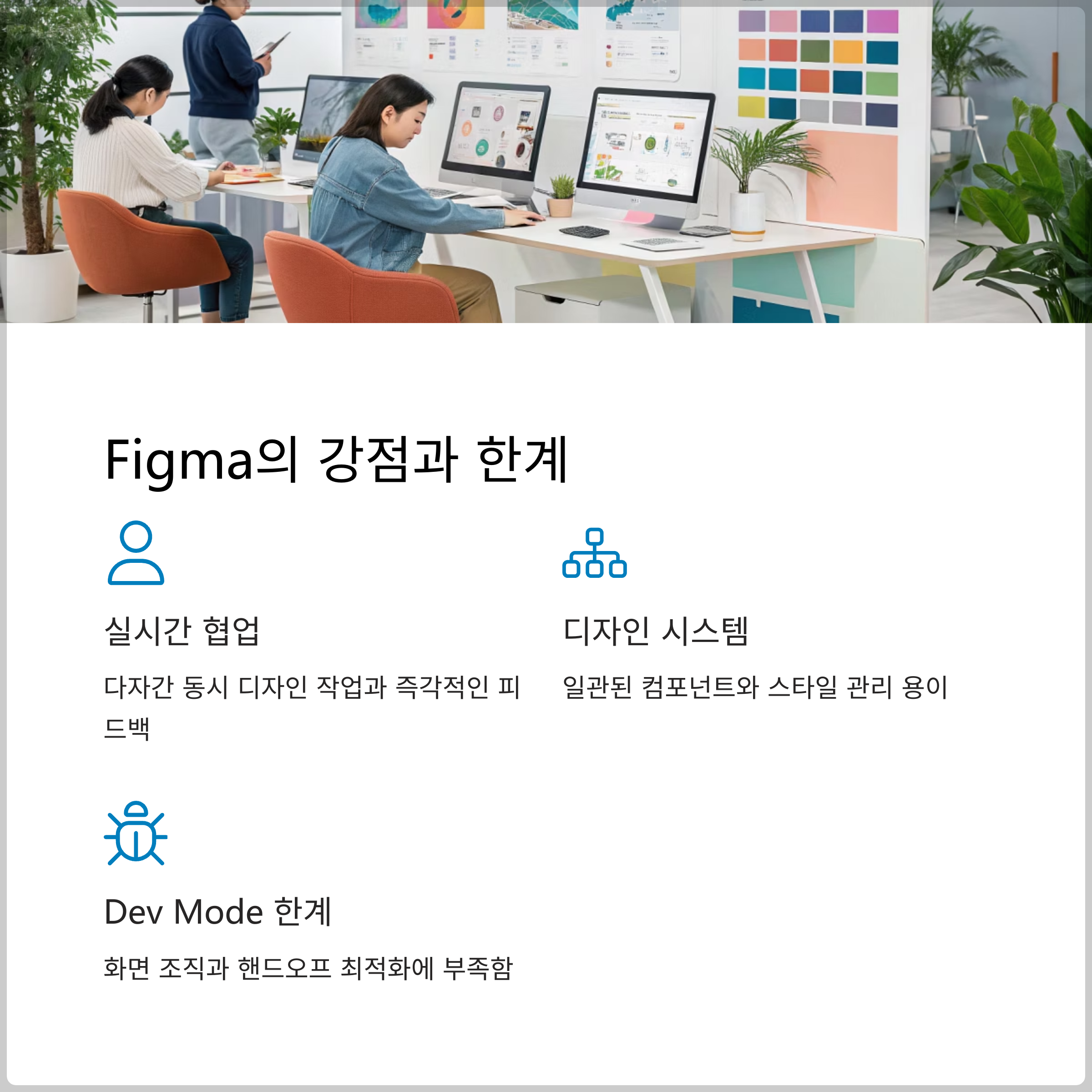 Figma Dev Mode는 개발자를 위한 기능이지만, 아직은 Zeplin처럼 명확하고 상세한 스펙 전달이나 버전 관리 측면에서 일부 부족한 부분이 있습니다. 대규모 프로젝트에서는 추가적인 핸드오프 툴이 필요할 수 있습니다.