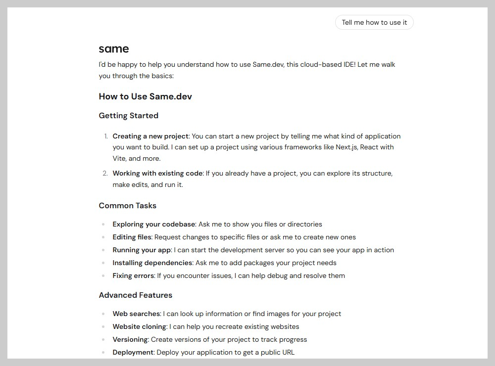 1. Same.dev 접속 | Same.dev 홈페이지에 접속합니다. |